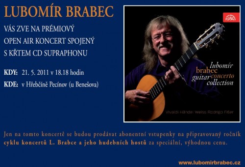 Ti, kteří milují jemnost i temperament klasické kytary jistě ocení výběr z nejúspěšnějších nahrávek Lubomíra Brabce, který právě vychází u vydavatelství Supraphon. Nechybí slavné Concierto de Aranjuez Joaquína Rodriga, kytarový koncert Antonia Vivaldiho nebo Koncert B dur Friedricha Händela. Album Guitar Concerto Collection pokřtí Lubomír Brabec v sobotu 21. května 2011 na speciálním koncertě v Hřebčíně Pecínov.