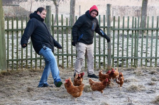 Scéna z drůbežárny byla spíš vtipná než akční. Akční byla v tom smyslu, že se točila velmi brzy ráno v polovině února a teplota se pohybovala těsně pod nulou, což nebylo zrovna příjemné. Majitel drůbežárny všechny přítomné upozorňoval, ať jsou opatrní, že slepice jsou poměrně útočné. Jenže když dostaly opeřené dámy pokyn, aby zběsile létaly kolem Sváti, moc nespolupracovaly, z kurníku se jim do takové zimy a hlavně tak brzy ráno vůbec nechtělo. Jen nerady vylezly a decentně našlapovaly v ojíněné trávě kolem přivázaného Sváti. Tak nastoupila rychlá rota – parta rekvizitářů, kteří začali slepice nahánět, aby se opeřené herečky trochu probraly k životu.