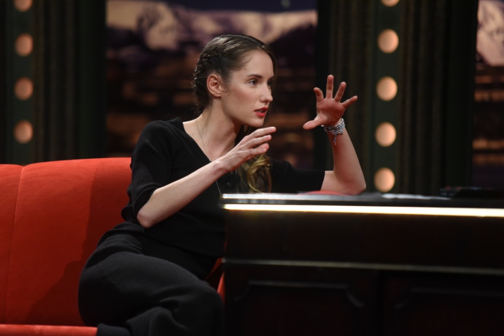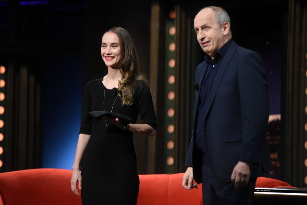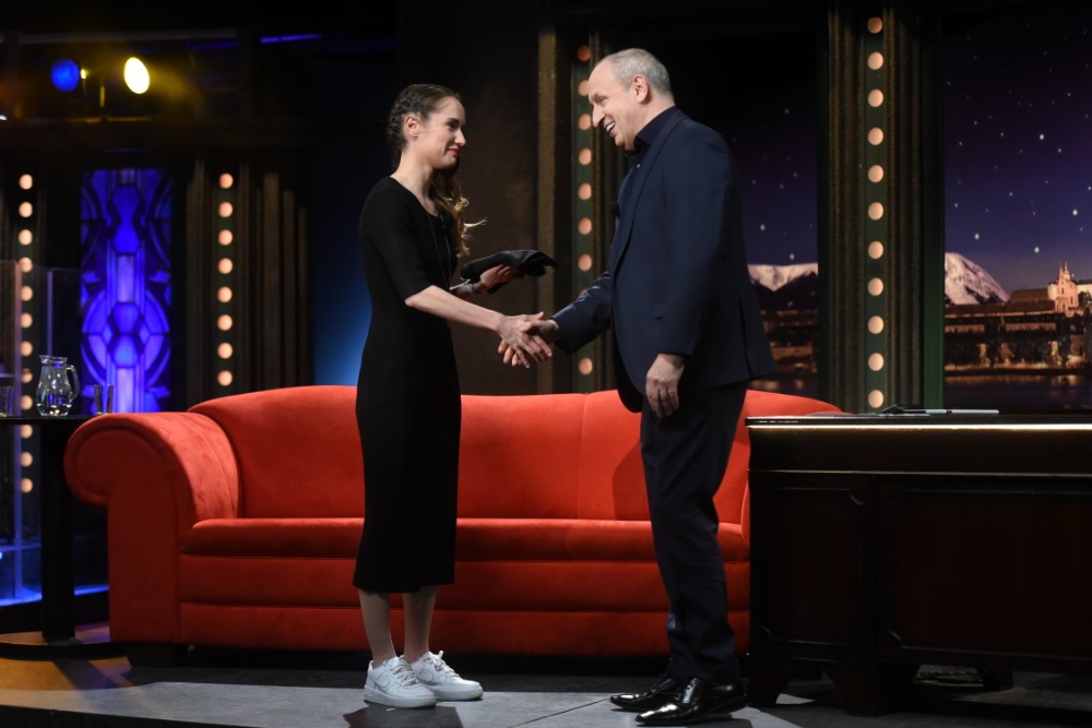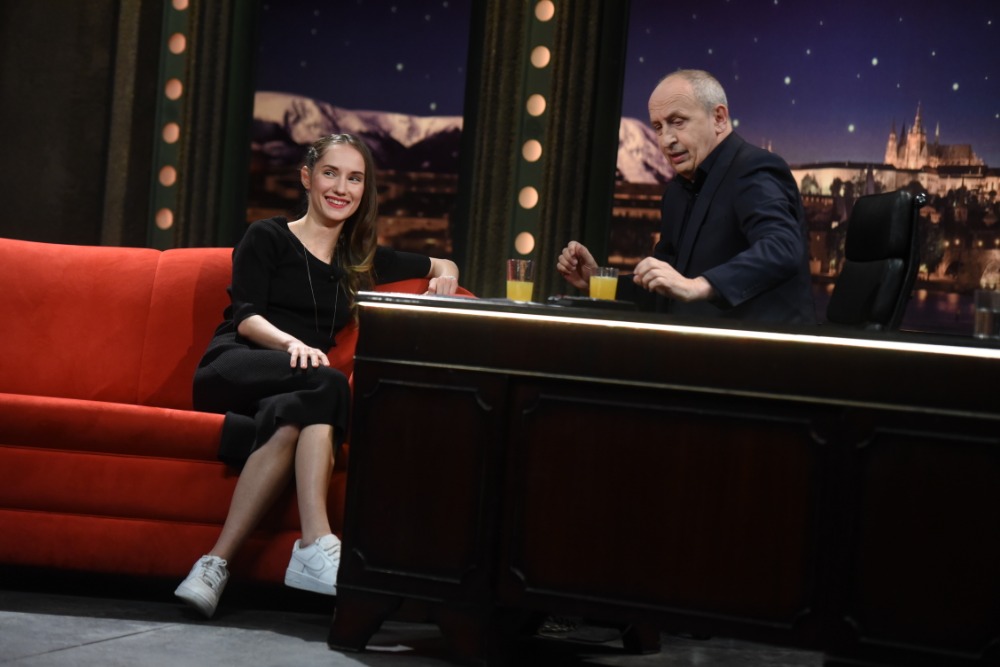 Čerstvá držitelka Českého lva za vedlejší roli ve filmu režiséra Olma Omerzua Všechno bude, mladá herečka Eliška Křenková, se uvelebila v červené pohovce v televizní Show Jana Krause. Kromě filmu se tato herečka a absolventka taneční konzervatoře a DAMU věnuje také divadlu, účinkuje například spolu se svou hereckou kolegyní a kamarádkou Terezou Voříškovou ve hře Amerikánka, kterou uvádí Jatka 78.