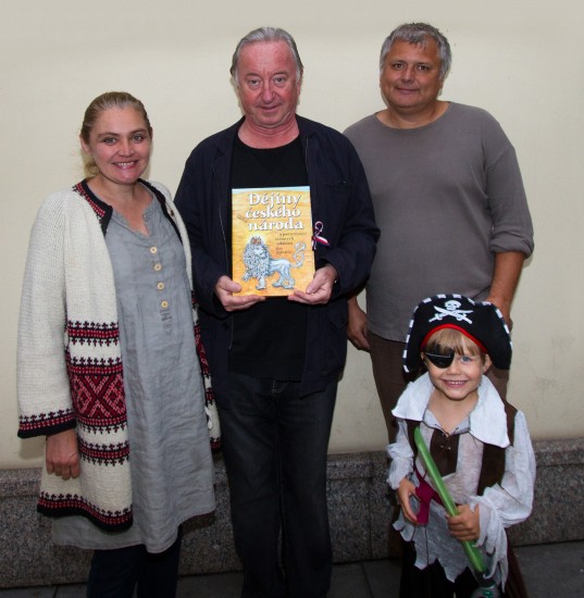 Na snímcích s leporelem Dějiny udatného českého národa je Jiří Lábus, Lucie Seifertová s manželem Petrem Prchalem alias Panchem a jejich děti – čtyřletý Antonín a měsíční Petr Jaroslav. „Minulý týden byl Toník na maškarním a od té doby se odmítá svléknout z pirátského. Prý se převtělil do Jacka Sparowa z Pirátu z Karibiku,“ prozradil nám se smíchem Pancho.