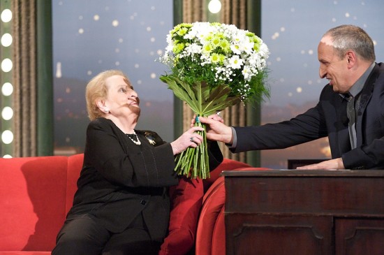 Podívali se spolu na video, kde Madeleine Albrightová hraje na bubny se symfonickým orchestrem. „Neměla byste chuť si taky zahrát? My tady máme také bicí,“ podotkl moderátor. „Ale proč ne?“ překvapila Albrightová a usedla za bicí.