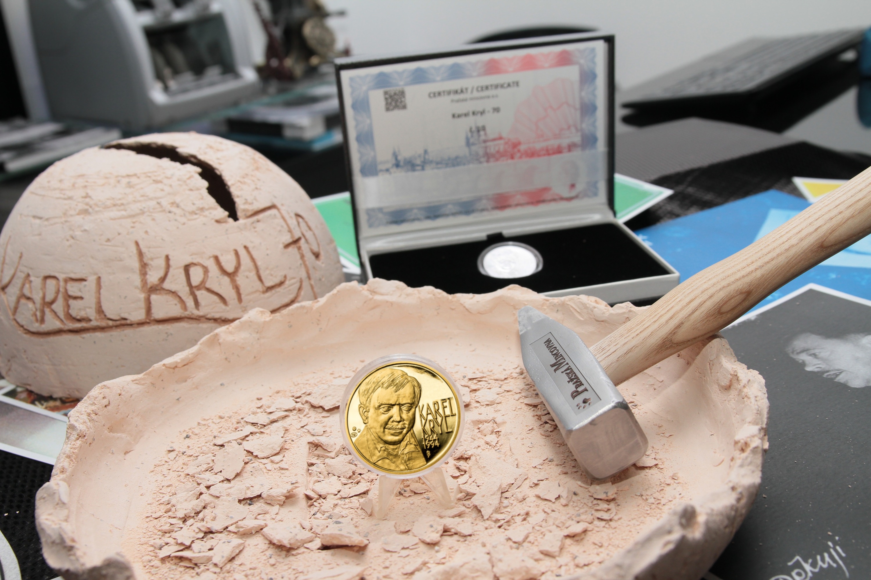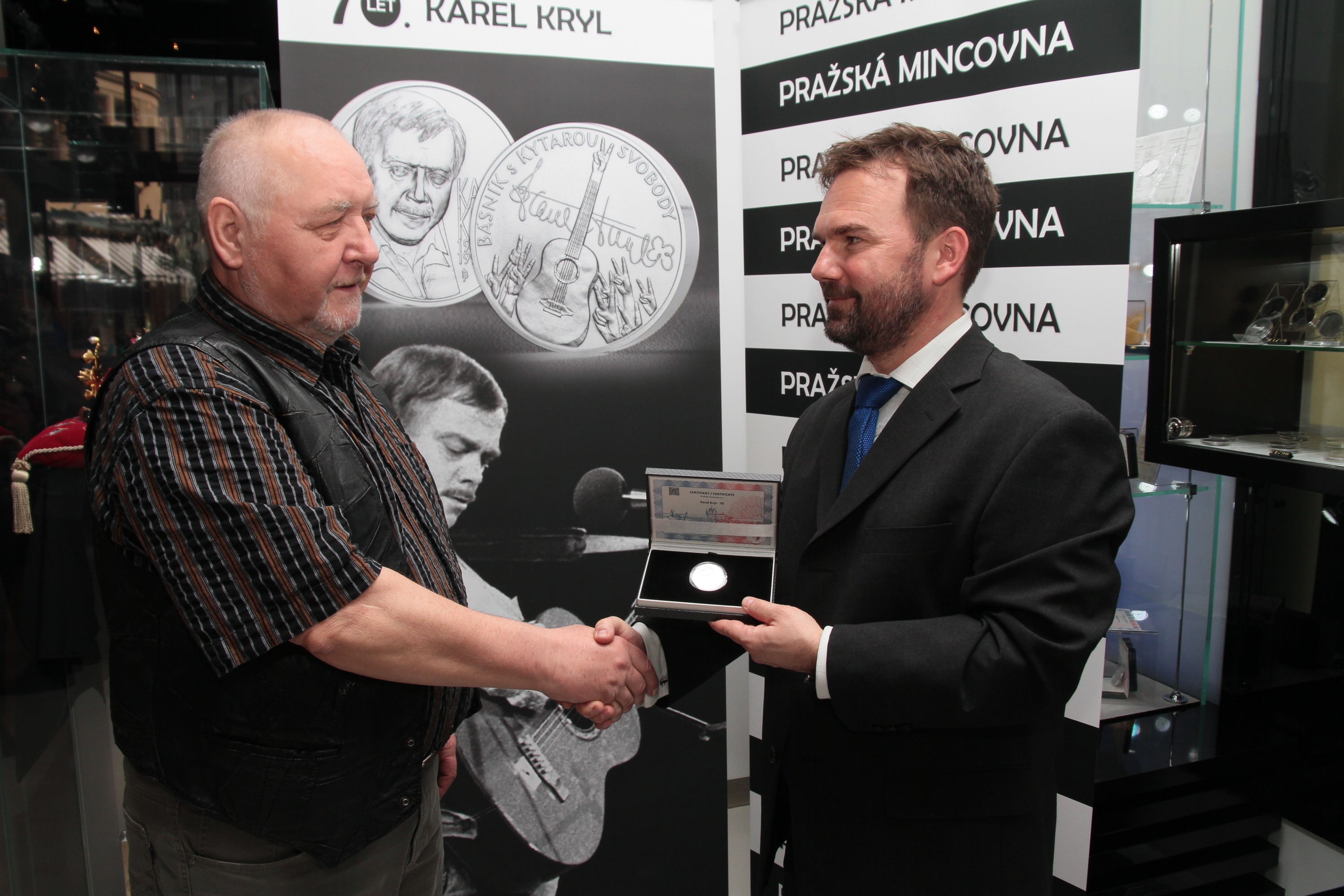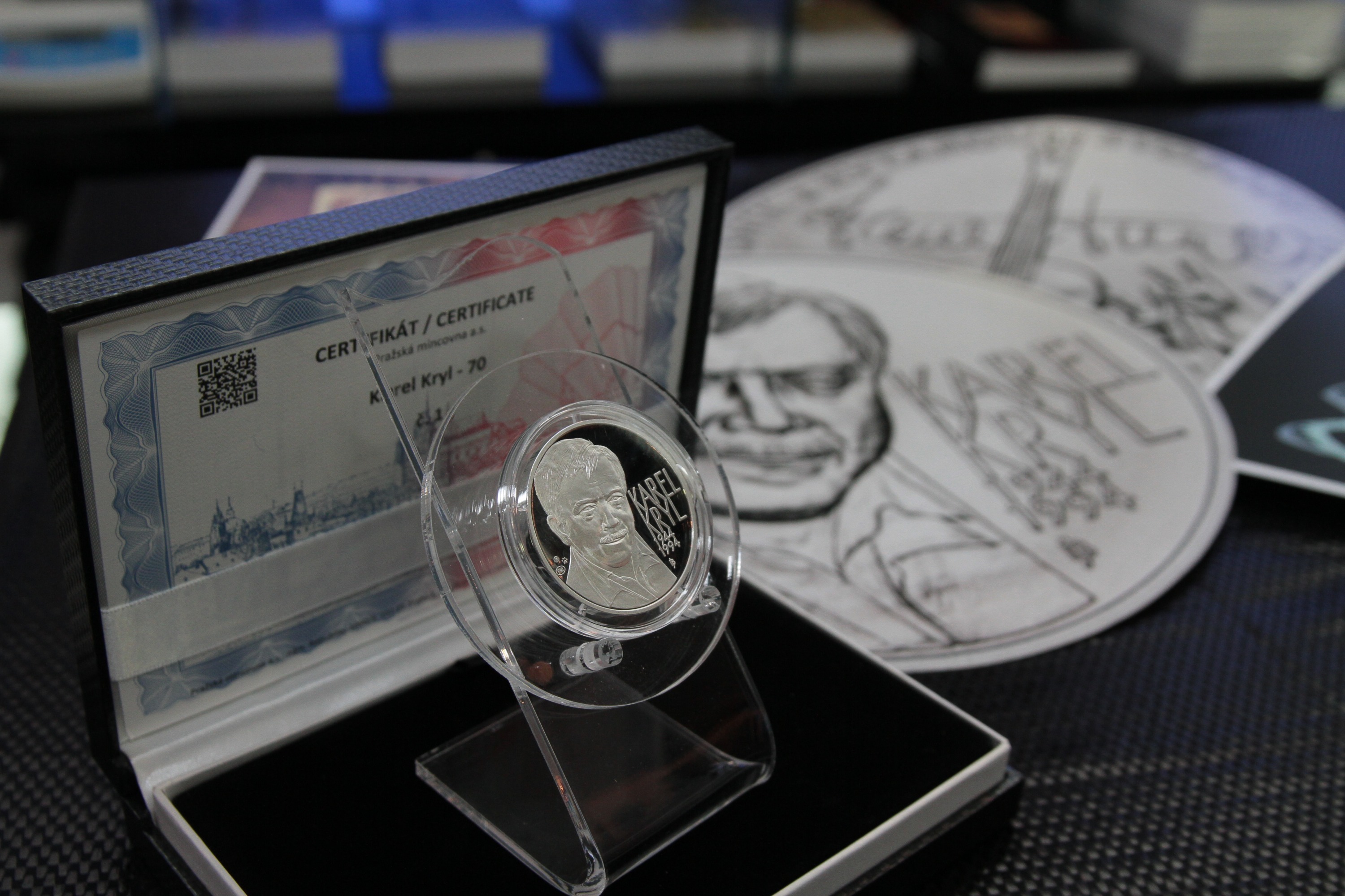 Exkluzivní ražbu k sedmdesátému výročí narození zpěváka Karla Kryla, »pokřtil« v Obecním domě v Praze jeho bratr Jan. Slavnostní prezentace se zúčastnil také autor výtvarného námětu numizmatické novinky výtvarník Jaroslav Bejvl. Ražbu realizovala Pražská mincovna, která návrh vtiskla do ryzího zlata a čistého stříbra. Raritní emise je číslovaná a její atraktivitu podtrhuje také nízký náklad.