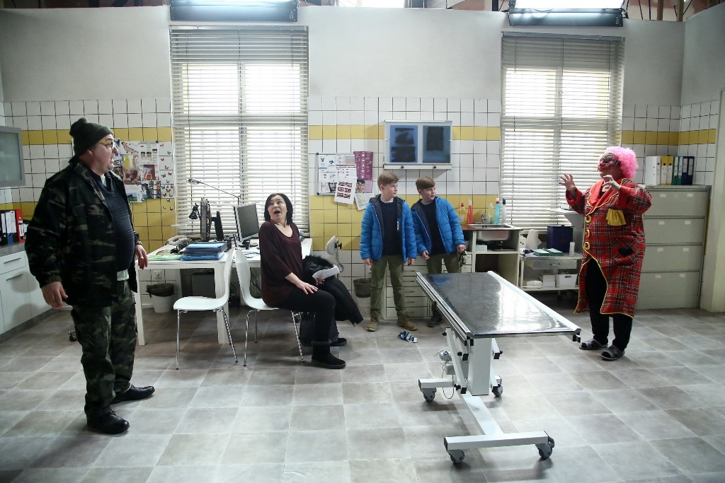 Jenže tady měla herečka s klaunem zcela jiné plány, a jak se ukázalo, kluci nejsou jediní, kdo se ho bojí. Strach z něj má i manžel Karel, který děsivého klauna viděl v hororu a od té doby z nich má fobii. Takže když vtrhne do ordinace a uvidí klauna, rovnou se skácí k zemi.