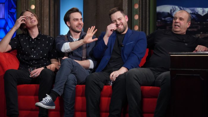 Zajímavou formu zvolil ale i prostřední Ondřej. „Poprvé jsem přijel s tím, že si budeme pořizovat pejska, a ukázal jsem mu jakoby časopis, ve kterém jsou štěňátka, ale vložil jsem tam taky ultrazvuk.“ Otec Petr to upřesňuje: „Dal mi časopis a řekl vprostředku je ta rasa, kterou jsme si vybrali. Já jsem nalistoval, tam byl nějaký dalmatin a pak tam byl dolepený ještě ultrazvuk.“ „A druhý, to je teď dva týdny staré,“ dodává Ondřej, který se svým otcem aktuálně zkouší představení z pozice režiséra. „V osm ráno proběhl porod, u kterého jsem byl, a první, co řekla moje nastávající Terezka, bylo, jé, to je skvělé, to ještě stihneš zkoušku, táta nebude naštvaný… takže jsem šel rovnou z porodnice na zkoušku a řekl jsem mu to mezi řečí, jakože tati, promiň, dnes nemám text, protože před dvěma hodinami se ti narodila vnučka. A on to hledal a říkal, na jaké stránce, nebo co, já tomu nerozumím,“ baví diváky.