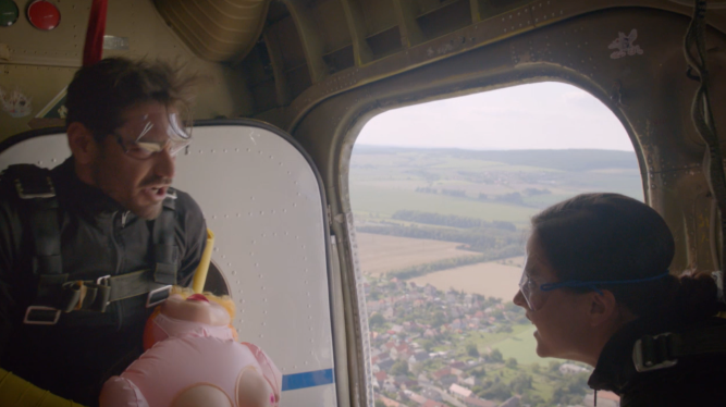 Druhou zkoušku odvahy absolvoval herec naopak ve vzduchu. Společně s Evou Josefíkovou prováděli pokus, který je zavedl do letadla. „Normálně jsme vzlétli a samozřejmě jsme byli jištění. Cestou jsme vyhazovali figuríny a musím říct, že to bylo nebezpečné. Kdyby se vám ty panny plné vody, které jsme vyhazovali, třeba zahákly za oblek nebo nám v nich zůstala ruka, tak by asi došlo k úrazu,“ přemýšlí Kotek. „Zase bych se do takových věcí nehrnul, nejsem milovník létání, ale když točíte, tak se pohled na věc úplně změní. Myslím, že tyhle scény nás bavily všechny. Byl to zážitek, který nás stmelil. I produkce byla odvážná, protože jsme to mohli dělat sami, a to rozhodně dobrému výsledku taky pomáhá.“