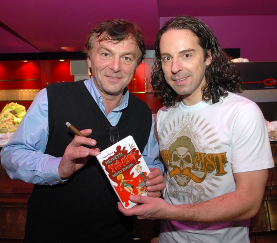 Richard Sacher s hercem Pavlem Trávníčkem v Divadle Hybernia na křtu knihy Největší trapasy mého života.