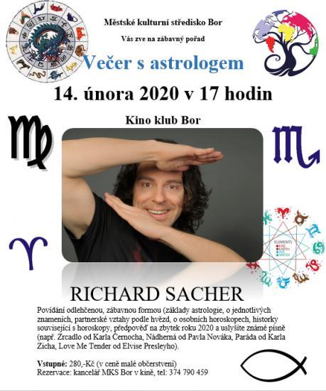 Moderování videí, v nichž na sociálních sítích představoval Čechům hotely, pláže a památky v zahraničních dovolenkových destinacích, se v uplynulých třech letech věnoval novinář, autor deseti knih, zpěvák, moderátor a astrolog Richard Sacher. „Kvůli práci v cestovním ruchu a také z osobních důvodů jsem dočasně omezil umělecké aktivity. To se během letoška změní,“ prozradil hlavní a jediný aktér autorského zájezdového pořadu Večer s astrologem. Ten se uskuteční například na Valentýna, tedy 14. února 2020, v kino klubu v Boru u Tachova.