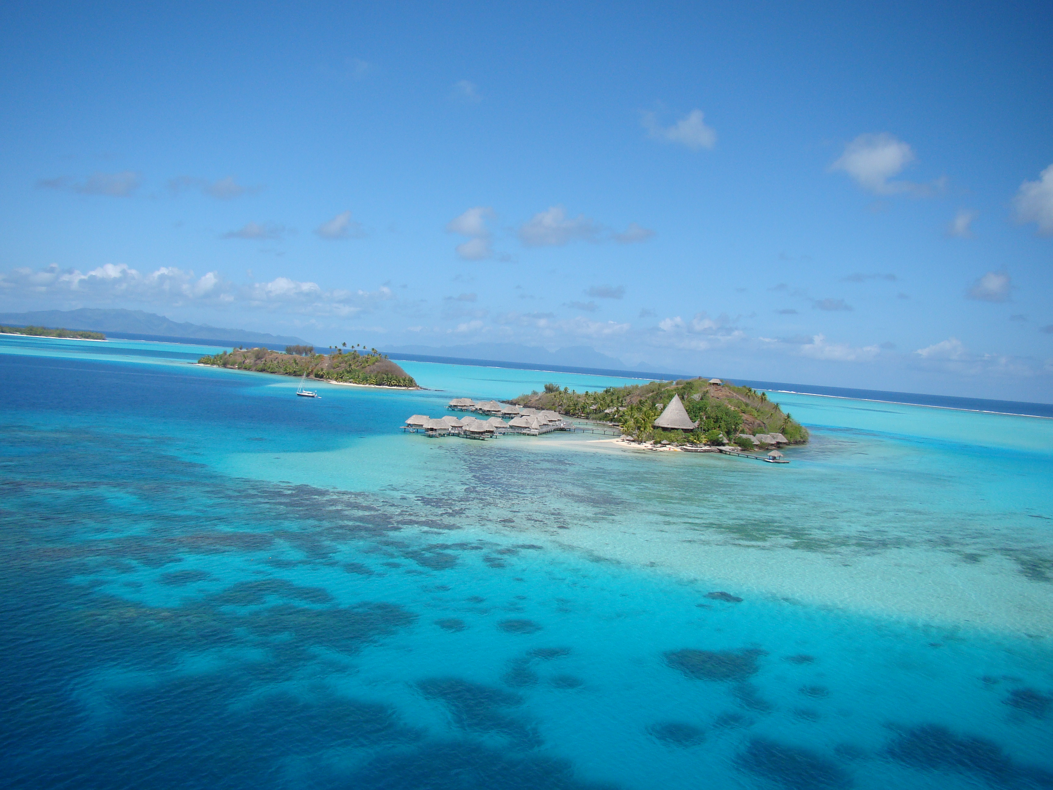Dívala jsem se z malého okna letadla pod sebe na nekonečný oceán a na mraky pod námi, když tu najednou se bílá oblaka rozestoupila a já jsem pod sebou zahlédla něco, co mne opravdu vyrazilo dech. Z nekonečného oceánu se tyčil ostrov s pohořím obklopen tak úchvatnou lagunou, jíž barva a krása se nedá slovy vystihnout. Nevelký ostrov a jeho modře zářící lagunu obklopoval prstenec korálového útesu. Byl to pohled, na který nelze zapomenout. Obzvláště, když máte pocit, že se ostrov najednou zjevil z oblak a z oceánu pod vámi.