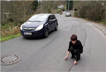 Na snímku, který vznikl druhý den po nehodě, ukazuje Olga Rotreklová jak dopravní policie označila barvou dřecí stopy, které jsou na straně motocyklisty. „Právě projíždějící tmavý vůz jede ve směru jízdy paní Rolincové a pokud by byla pravda, že jela u krajnice, jak tvrdí a jak jede tento vůz, vůbec by se s manželem nestřetla, neboť je jasně vidět jak velká mezera je mezi mnou, která jsem na místě středu, který dokazují dopravní policií barvou označené dřecí stopy a mezi projíždějícím vozem,“ tvrdí Olga Rotreklová.
