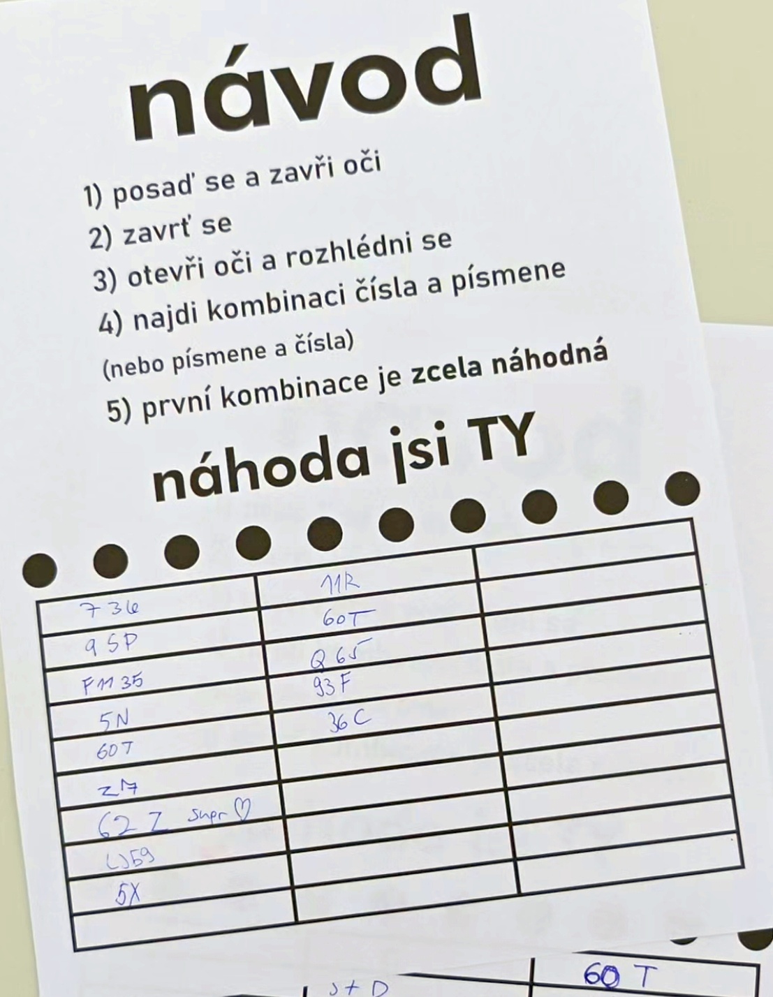 Instalace plná distraktivních prvků byla velmi vytížená a během pouhých 90 minut výstavy se do připravené tabulky zapsalo téměř pět desítek návštěvníků. Někteří jen uvedli svoji kombinaci znaků, jiní přidali poznámku – a jeden z nich jednoduše napsal »Supr❤️«. „Byla to pro mě obrovská pocta, potvrzení, že sdělení dorazilo. Že někdo pochopil, co se mu skrze ten jednoduchý systém snažím říct a že na moment zažil náhodu jako stav.“