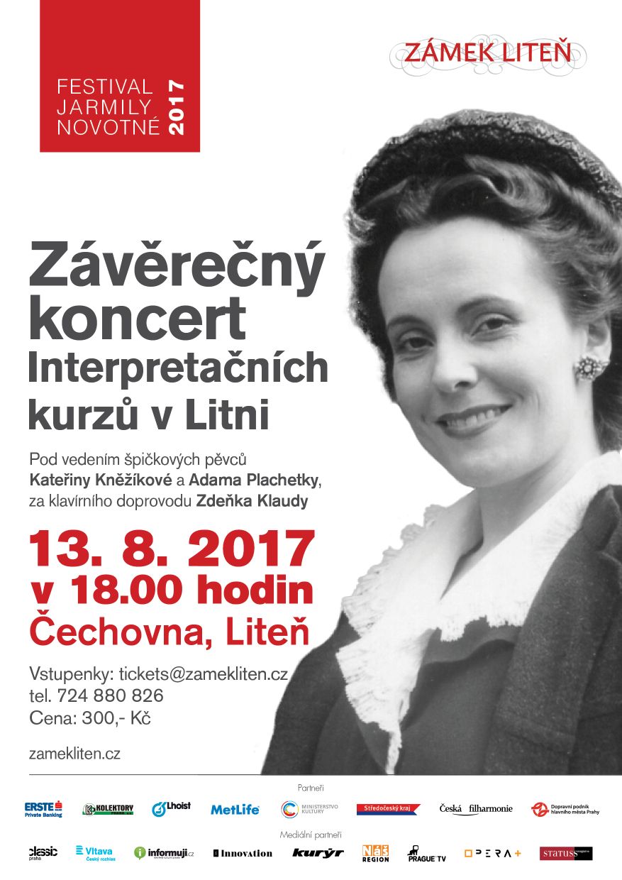 Ani letos nemůže v programu Festivalu Jarmily Novotné chybět Závěrečný koncert Interpretačních kurzů, jehož poslech spolu s přitažlivou silou letního zámeckého sídla v Litni každoročně okouzlí nejednoho návštěvníka. V roce 110. jubilea narození sopránové legendy a světově významné osobnosti Jarmily Novotné, jíž je festival zasvěcen, se vedení pěveckých kurzů ujmou špičková sopranistka a sólistka Národního divadla Kateřina Kněžíková a jeden z našich nejvýznamnějších reprezentantů na mezinárodní scéně, basbarytonista Adam Plachetka. O klavírní doprovod se jako každoročně postará šéfkorepetitor Národního divadla Zdeněk Klauda. Interpretační kurzy v Litni 2017 pořádá ve dnech 9. a 13. srpna nezisková organizace Zámek Liteň, z.s. v rámci 6. ročníku Festivalu Jarmily Novotné. Letošní závěrečný koncert připadá na neděli 13. srpna a jako obvykle se odehraje v sále historického objektu Čechovny.