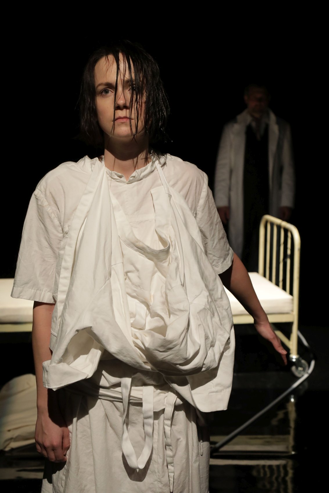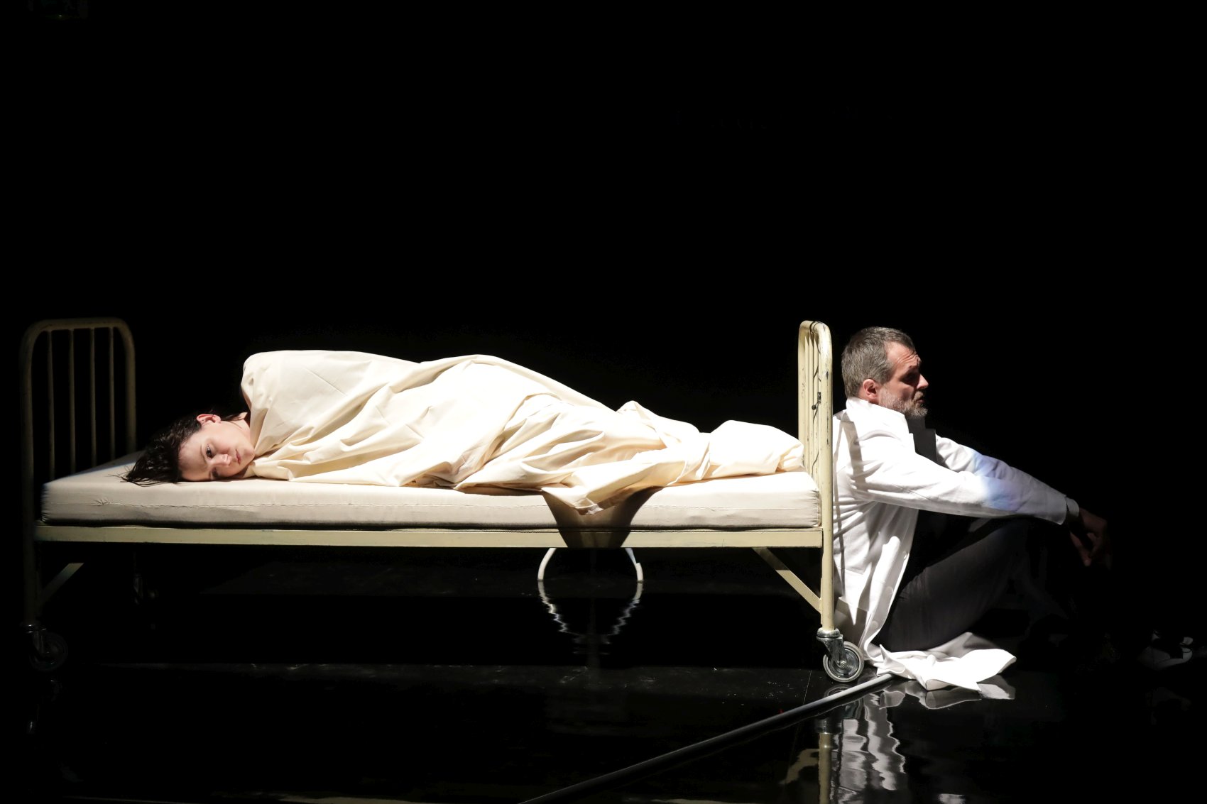 Téma jako by se zdálo naprosto ideálním výchozím materiálem pro tvůrčí metodu předního soudobého dramatika, spisovatele a libretisty Christophera Hamptona – v roce 2002 jej zpracoval ve hře The Talking Cure (Řeči léčí), do češtiny pak text přeložil o několik let později Milan Lukeš. „Inscenace zdůrazňuje zejména divadelní kvality předlohy – důraz je položen na rozehrání dramatické situace prostřednictvím hereckého stylu ‚na blízko‘, dále na představení důmyslné jevištní metafory a v neposlední řadě na zaujetí diváka prostřednictvím prvků rozličných divadelních žánrů – dramatu, ale i komedie. Byť inscenace ve značné míře vychází z realistické fabule příběhu, dochází v určitých momentech ke zhušťování v rovině času i prostoru. Před divákem tak vyrůstá svět, který je univerzálním hracím prostorem, sloužícím pro zobrazení strhujícího milostného příběhu mezi Spielreinovou a Jungem, stejně jako pro zachycení postupného (ale tvrdého) rozkolu mezi Jungem a Freudem,“ uvádí dramaturg Adam Gold.