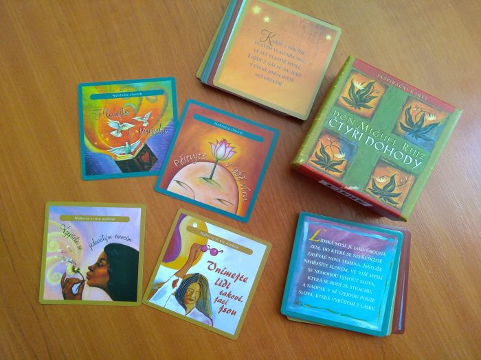 Máte rádi Čtyři dohody? Je to milé čtení, které mi svého času přišlo přesně do nálady a rozpoložení. Karty s touto tématikou pak umožňují začíst se do myšlenek těchto knih i v jednoduché formě a odnést si dojmy, ta pravá slova do všedního dne… Jednoduše, vytáhnout si z balíčku karet právě takovou myšlenku, jakou vás bude bavit se zaobírat. Nebo jakou zrovna potřebujete číst.