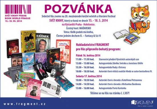 Páteční program otevře již tradiční předávání Výročních autorských cen nakladatelství pro nejúspěšnější novinku a dlouhodobý přínos. Oblíbená autorská dvojice Zdeněk Svěrák a Jaroslav Uhlíř bude podepisovat mimo jiné úspěšnou podzimní novinku plnou písniček, operek a veselých textů Dětem. Ruda z Ostravy k podpisu rád připojí také originální věnování do své knižní »dvojky« Selebryta!!!. Na závěr pátečního dne se seznámíme s vítěznými povídkami literární soutěže Hledá se autor bestselleru. V sobotu se na besedách dozvíme, co nového chystá Kateřina Petrusová a Michaela Burdová. Program nakladatelství Fragment uzavře autogramiáda známého kreslíře a humoristy Pavla Kantorka.
