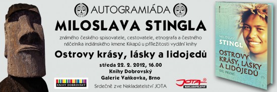 Autogramiáda legendy české cestovatelské literatury Miloslava Stingla se koná ve středu 22. února 2012 od 16 hodin v knihkupectví Knihy Dobrovský v Galerii Vaňkovka v Brně.