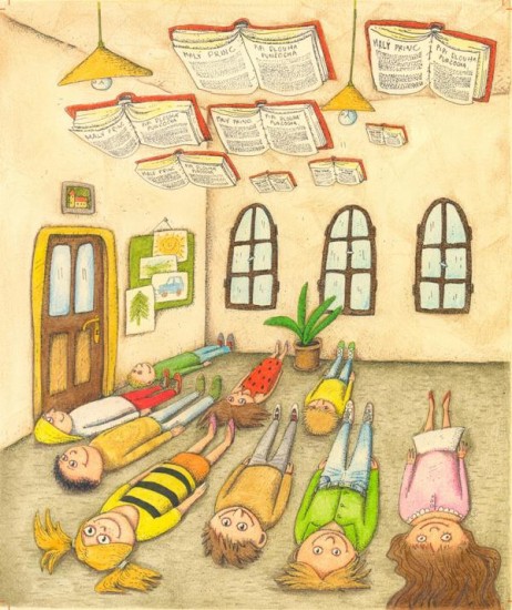 Ale musím říct, že slovenské vydání pro mě má stejný díl dobré nálady. Ilustrátora Mira Regitka znám už několik let a na výstavě jeho ilustrací v Prešově před lety jako bych měla Začarovanou třídu v jeho podání přímo před očima. Byla shoda šťastných náhod, že překladatelka do slovenštiny, Gábika Futová, spolupracuje s nakladatelstvím Perfekt, a že jedním z dvorních ilustrátorů tohoto nakladatelství je Miro Regitko.