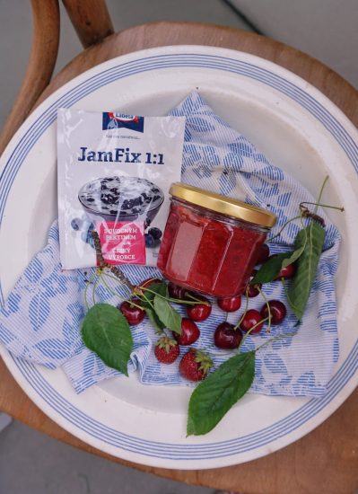 - Pokud je džem stále moc tekutý, přidáme ještě trochu JamFixu, který musí být smíchaný s cukrem – předejdeme tak hrudkování a opět krátce povaříme.