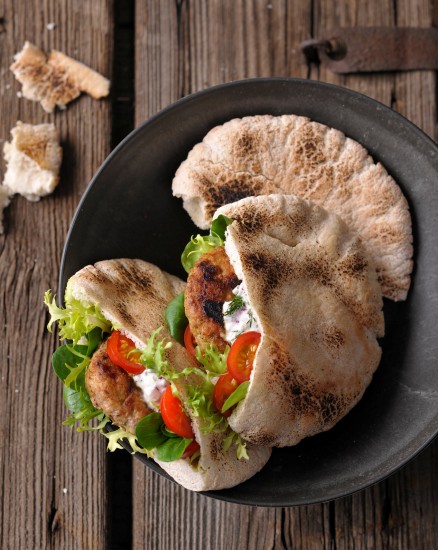 5. Jehněčí bochánky vložte do pita chleba a zalejte je jogurtovým dipem. Přidejte salátové listy, rajče a ihned podávejte.