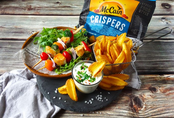 - McCain Crispers připravíme v troubě podle návodu na obalu. Mezitím zlehka opečeme špízy na grilovací pánvi tak, aby zelenina zůstala křupavá „na skus“.