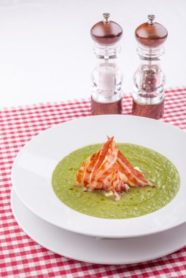 - Na talíře tvořte dvěma lžičkami malé nočky. Zalijte špenátovým krémem a ozdobte plátky pancetty a čerstvého špenátu.