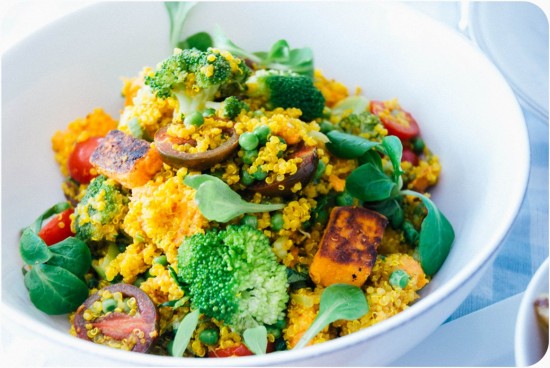 Salát ze sladkých brambor a kořeněné quinoi a brokolice