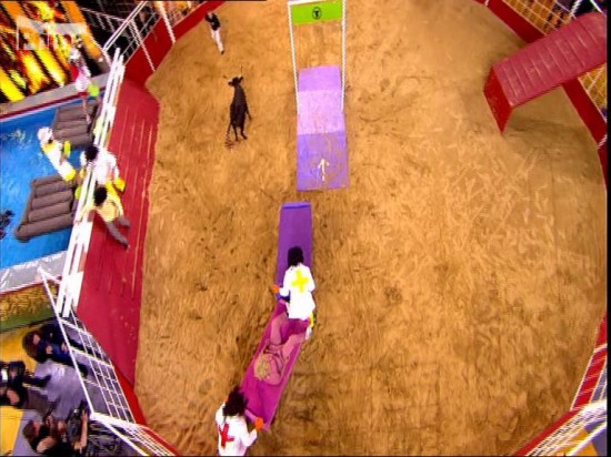 Ani dnes se naši soutěžící býkovi nevyhnou. Soutěží najednou dva týmy. Jeden soutěžící leží na nemocničních nosítkách v aréně a dva muži převlečení za zdravotníky ho musejí i s nosítky protlačit skrz bránu uprostřed arény k jejímu okraji, kde od dívky získají žeton. I s ním musejí pacienta odtlačit na druhý konec arény, kde vyskočí zdravý z nosítek a vyběhne ven. Místo něj na nosítka ulehne další člen družstva. Pořadí určí počet získaných žetonů. Hraje jedna dívka a čtyři muži.
