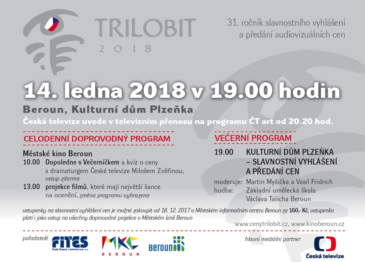 Udílení cen Trilobit 2018 odvysílá Česká televize od 20.20 hodin na stanici ČT art. Večernímu programu budou jako obvykle předcházet filmové projekce v Městském kině Beroun – pro děti Dopoledne s Večerníčkem s kvízem o ceny, odpolední a večerní projekce filmů, o kterých mluvila porota jako o nejžhavějších favoritech. Další informace jsou dostupné na cenytrilobit.cz, program v kině bude uveden rovněž na kinoberoun.cz.