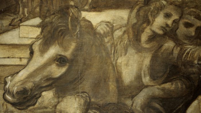 Jeho první zakázkou je obraz »Klanění Tří králů«, doplňovaná kompozice, která se zachovala v podobě přípravné kresby zobrazující přes sedmdesát postav, dvacet zvířat, přírodu a architekturu. Je to nejsložitější Leonardovo dílo. V následujícím období pracuje Leonardo v Miláně na dvoře vévody Lodovica Sforzy. Je mu třicet let a jeho pozornost se obrací k vyjádření emocí, které se odrážejí především v lidských očích, v pohledu, a dodávají obrazům život. Uchýlí se k několika pitvám lidského mozku a těla, aby zjistil, jak emoce vznikají a jak se přenášejí. Lidskou duši umisťuje do středu těla, pohrouží se do studia anatomie a snaží se vyjádřit trojrozměrnost pohybu. Mezi obzvlášť mistrné patří studie lidského ramene. Z této doby pochází i slavný obraz »Poslední večeře Páně«, v němž se šestačtyřicetiletý umělec soustředil právě na vykreslení emocí třinácti postav, rozdělených do skupinek po třech. Z množství přípravných náčrtů a studií se nám jich dodnes zachovalo pouze šest či sedm. Leonardo se pouští do rozměrného díla »Pojednání o malířství«, které ale – stejně jako mnoho dalších svých obrazů – nikdy nedokončí. Láká ho tajemství vesmíru a sil, které jím hýbou. Velkou pozornost věnuje i samotné realizaci obrazu, práci umělcovy ruky.