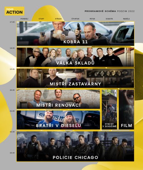 Adrenalin, reality show, akční filmy a seriály, hobby a sport, tím je pro diváky dlouhodobě atraktivní Nova Action. Mezi premiérovými cykly se objeví například dokument Svědkem katastrofy, jenž mapuje příběhy mezinárodních katastrof prostřednictvím jejich přeživších, nebo premiérová série Superstavby: Zázraky techniky, odhalující technologie ukryté v nejpozoruhodnějších stavbách světa, jako je vesmírná stanice ISS. V nových řadách se objeví i reality show Američtí sběratelé, Mistři renovací, Bratři v dieselu nebo Dannyho auťáky. Chybět nebudou ani oblíbené seriály v čele s Kobrou 11. Na své si přijdou i fanoušci akčních a válečných filmů, čeká je například Non-Stop, Drak přichází, Kam orli nelétají, Kellyho hrdinové, Odvěký zákon nebo Memphiská kráska. A budou pokračovat i přenosy z NHL.
