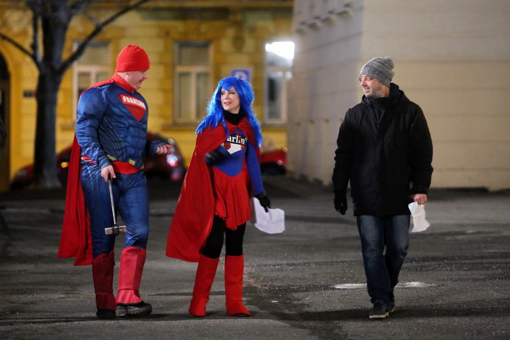 Nic tak nebránilo tomu, aby Danka s Pájou při své noční obhlídce zabránili přepadení. „Vím, že jsem se v tom kostýmu cítil nepatřičně, ale na chvíli jsem se tím hrdinou cítil být. Určitě jsem v okolí Podolí, kde jsme to točili, vzbudil hodně pozornosti. Dokonce mi jeden kolega-herec, který tam bydlí, řekl, že mě natočil z okna – a pak mi to ukázal,“ přiznal Michal Novotný, který jako Pája celé přepadení domluvil předem.