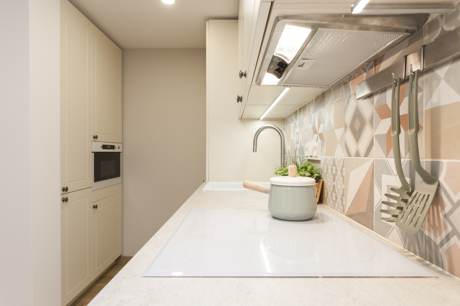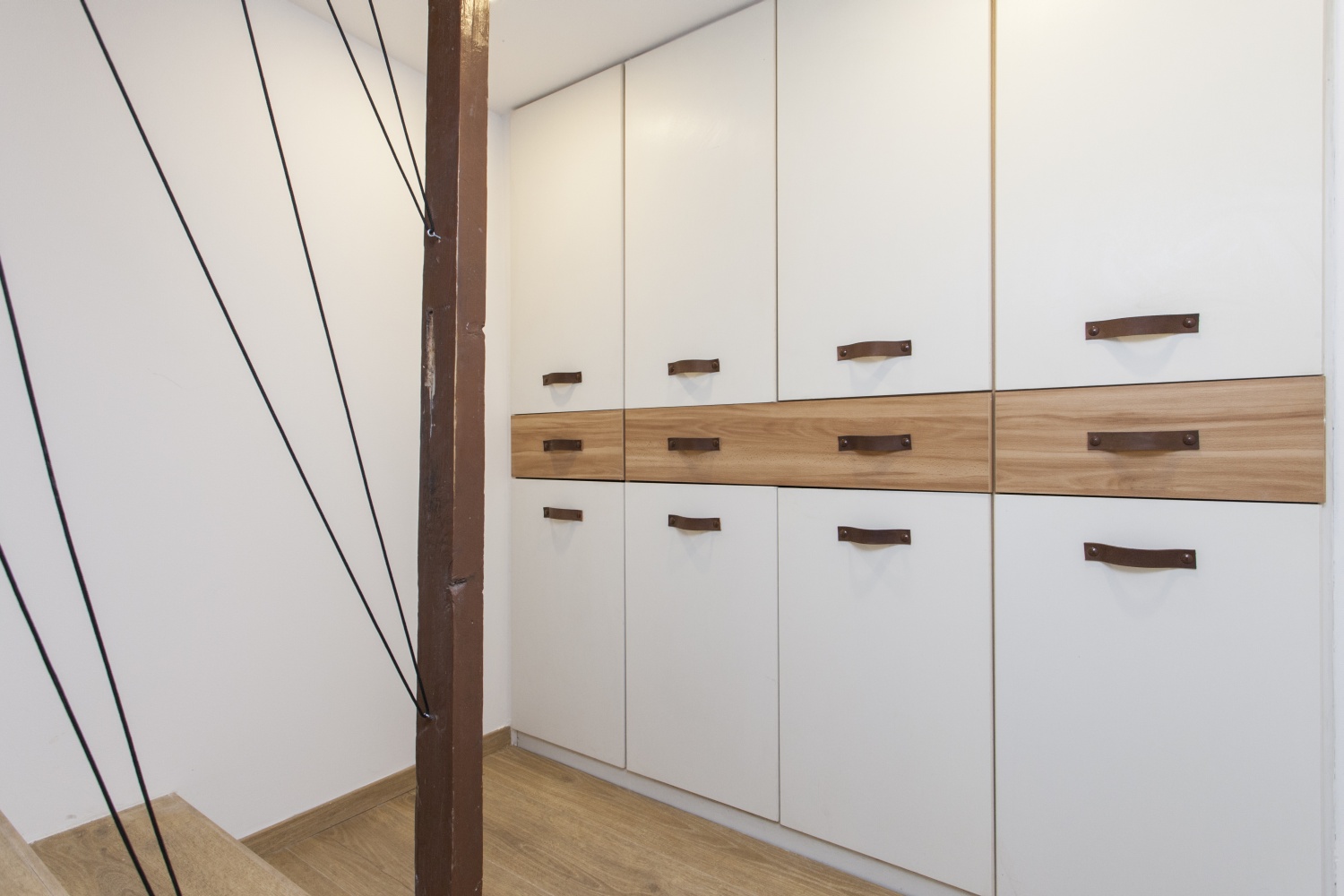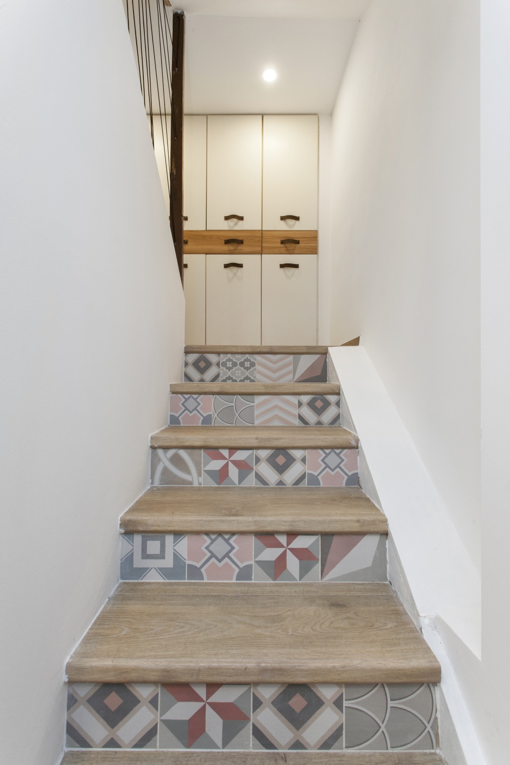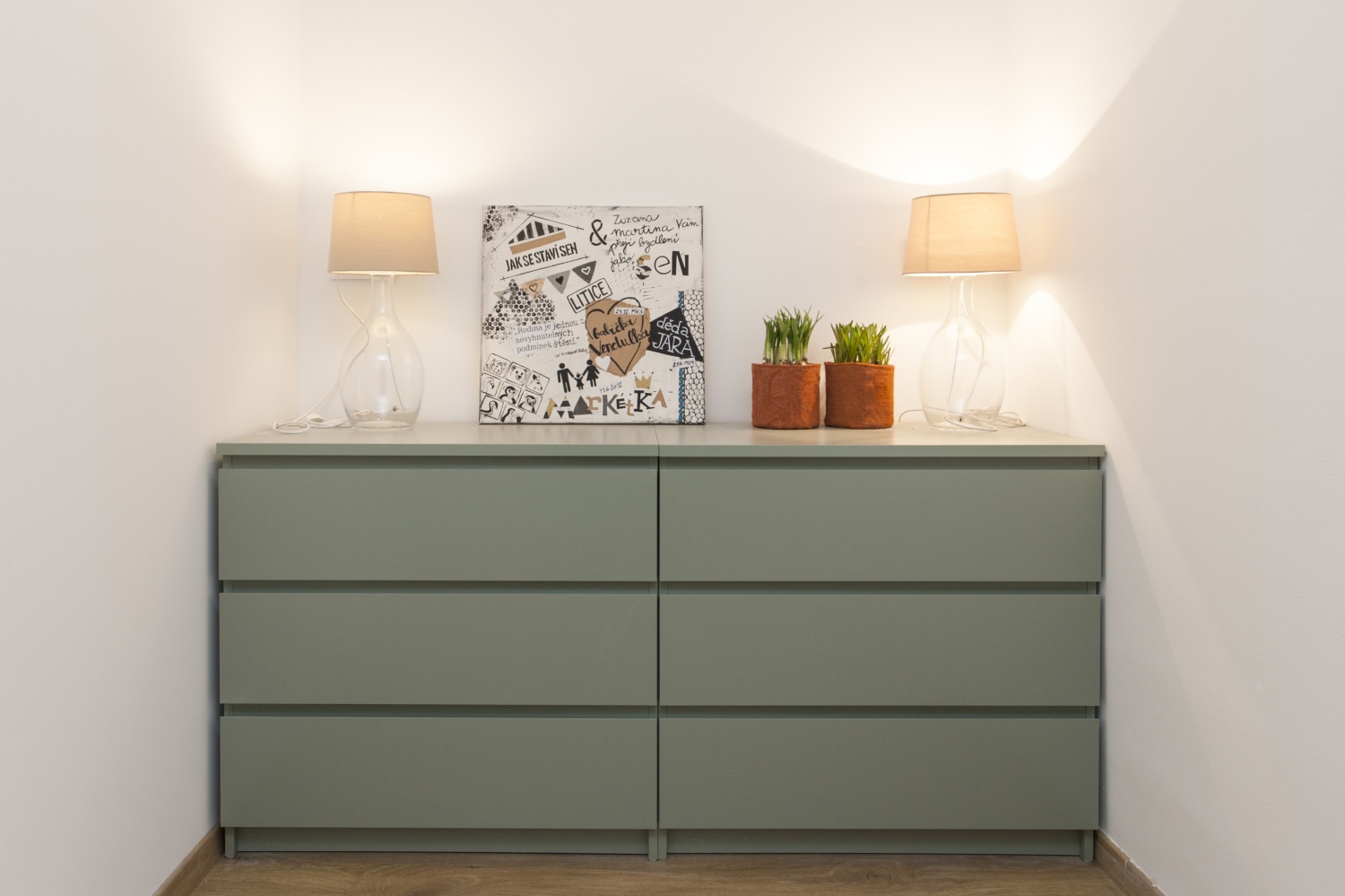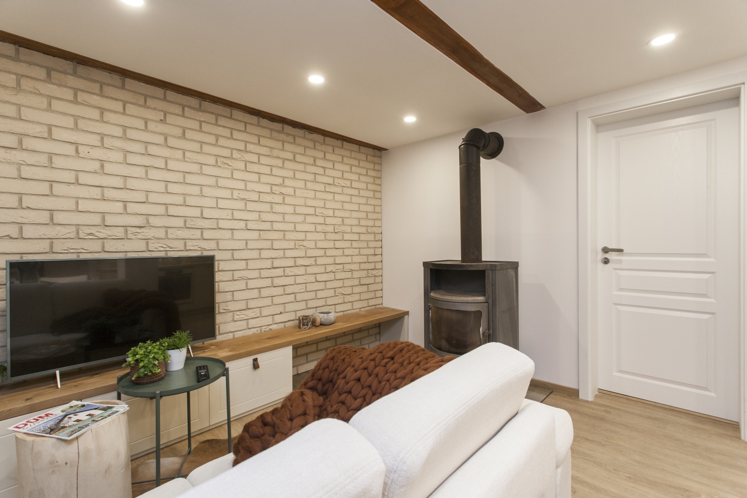 Na začátku jsme si musely společně sednout a říct si, v jakém stylu chceme chatku zařídit. Úskalím bylo to, že rodina, nebo spíše paní Vendulka, nesnáší chalupářský styl, takže jsme celou dobu měly toto na paměti. Ale faktem také je, že se chatka nachází v lese, tudíž zase nemůžeme z pohledu designu vytvořit minimalismus a úplně moderní interiér. Tak jsme hledaly kompromis. Kuchyň jsme zařídily moderně s moderními spotřebiči, ale doplnili o jemný obklad v patchwork stylu a dvířka skříněk nechaly vyrobit s jemným frézováním, aby kuchyň nepůsobila příliš moderně. Zvolili jsme světlé lamino, ne dřevo, aby naopak nepůsobila moc rustikálně. Zařizovací předměty jsme kombinovaly podobným způsobem. Moderní sedací souprava versus kávový stolek z kmene stromu. Moderní laminátová podlaha, ale na ní kravská kožešina. Moderní TV stěna, ale horní deska z masivního dubu. Stěny jsme obložili lícovými páskami ve světlé barvě, na nichž se krásně vyjímá moderní pojetí nové TV technologie s ambientním LED podsvícením. Zkrátka drželi jsme se celou dobu na hranici mezi modernou a rustikálním stylem, což, doufáme, vytvořilo vyvážený dojem.“