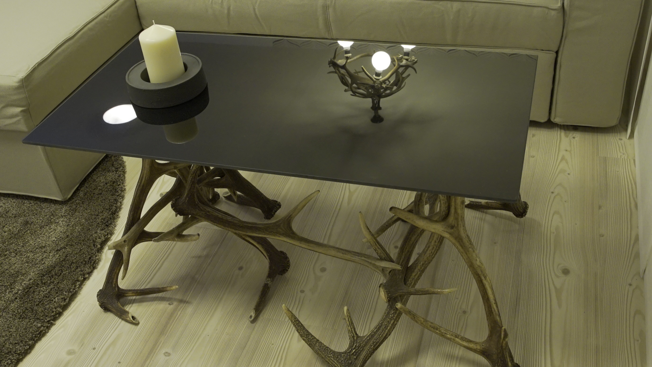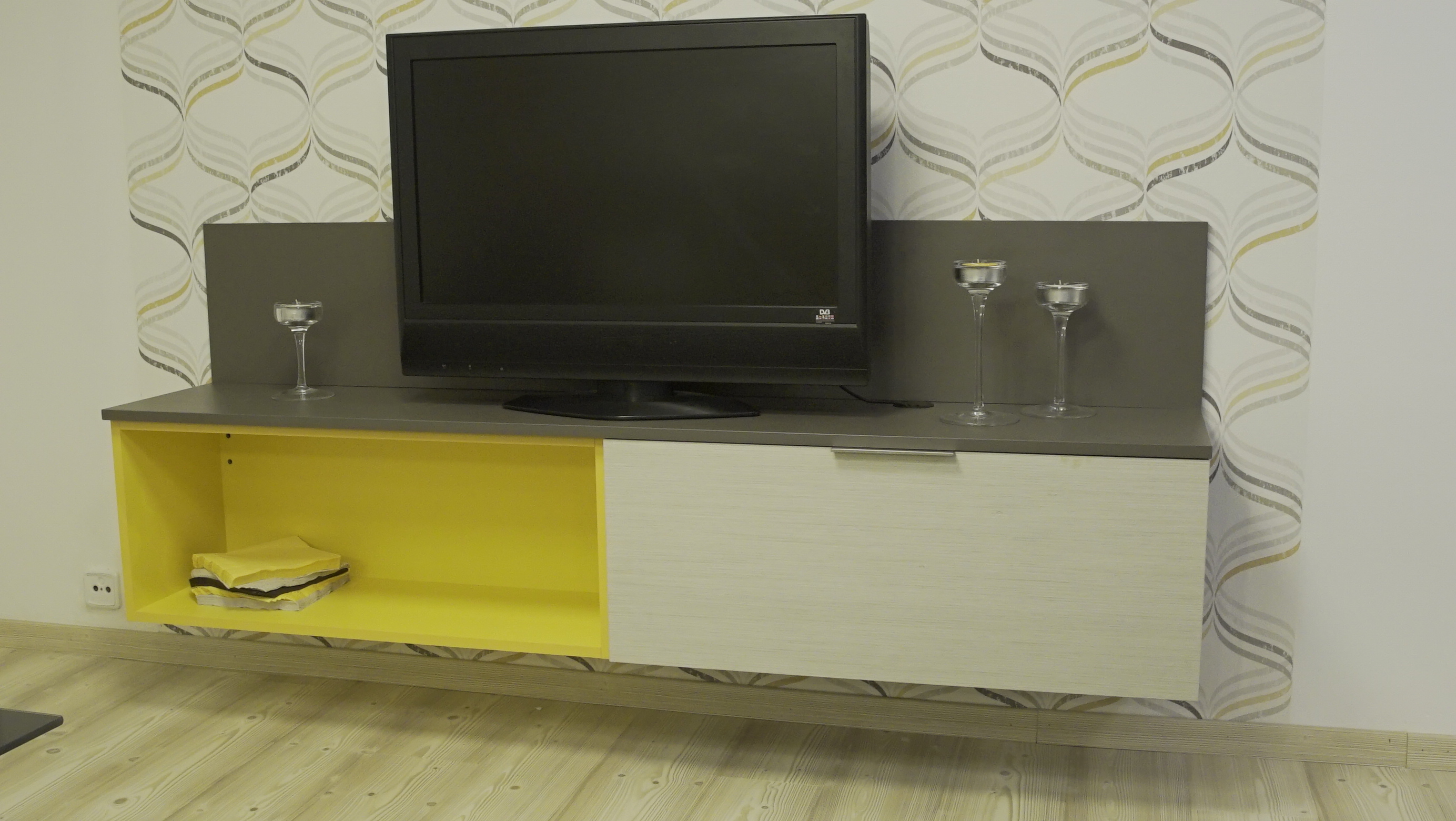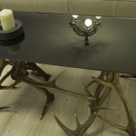 Kamila: „Hned nám bylo jasné, že to bude veliká proměna a že ručně vyrobený nábytek z parohů využijeme. Problémem a zároveň největší výzvou bylo všudypřítomné dřevo a právě motiv parohů. Styl proměny bych pojmenovala jako moderní s avantgardními prvky parohů. Parohy však daly základ ostatnímu vybavení, ve kterém se opakuje křivka. Například na tapetě či světlech. Těžký dřevěný stůl jsme nahradili skleněným, židle zvolili transparentní plastové. Cílem bylo prostor uvolnit, dostat do něj vzduch a světlo, a to se nám myslím povedlo. Do budoucna bych určitě doporučila vrhnout se na rekonstrukci dosluhujícího bytového umakartového jádra.“