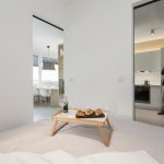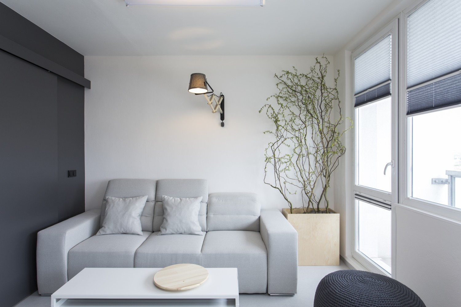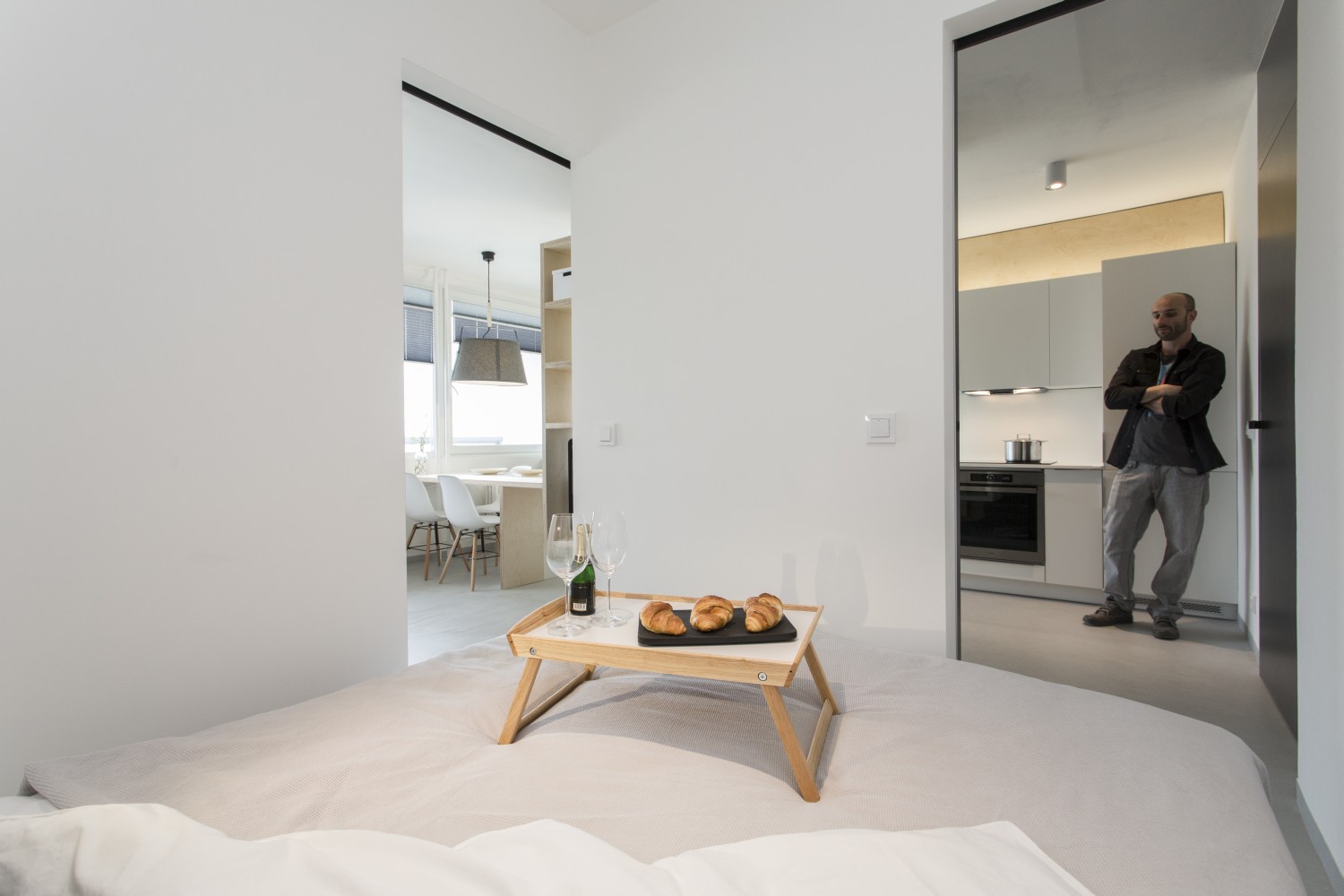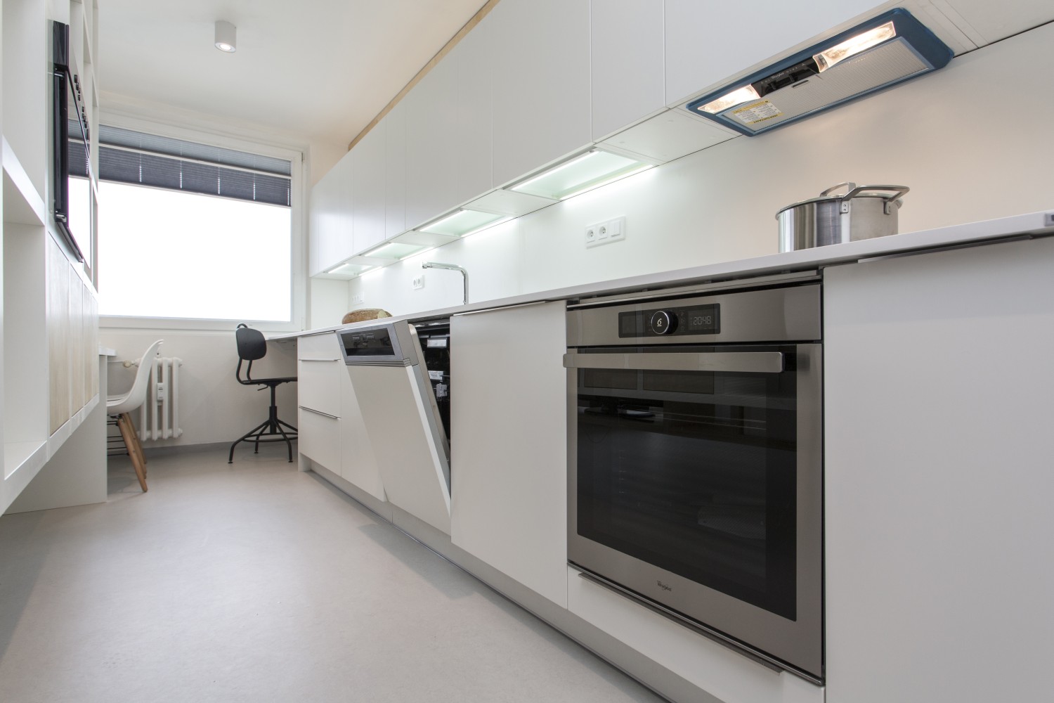 Nejvíce jsme asi pyšní na nápad s levitující knihovnou, která zároveň slouží jako úložný prostor pro kuchyň. Díky této konstrukci, která působí velmi vzdušně, jsme spojili původně plnou příčkou oddělené prostory pro přípravu jídla a obývák. I když sedíte v obýváku, máte stále vizuální kontakt skrz knihovnu s osobou připravující jídlo v kuchyni a obráceně. Díky absenci nohou a jakékoli podpory, vše působí velmi lehce a záměrně až nelogicky. Subtilní jídelní stůl je propojen s touto truhlářskou konstrukcí a vytváří dojem, že celou tíhu nese on. Styl je jednoznačně současný, moderní. Odpovídá i přání majitelů, kteří chtěli bydlet v novém, soudobém interiéru. Jelikož jsme museli trochu čarovat a vytvořit dojem většího prostoru, než doopravdy je, zvolili jsme velmi jemné světlé tóny jako základ. Tvoří jej bílá barva na stěnách, v kuchyni, truhlářských konstrukcích v kombinaci s březovou překližkou. I podlaha je světlá – světle šedé marmoleum, které dotváří neutrální obal pokoje, do kterého jsme potom naopak velmi kontrastně vložili »černou krabici« na spaní, natřenou antracitovou barvou. Přiznali jsme tím tento nově vložený prvek a nesnažili se ho ničím zamaskovat. Doporučili bychom ještě zrekonstruovat vstupní halu s chodbou.