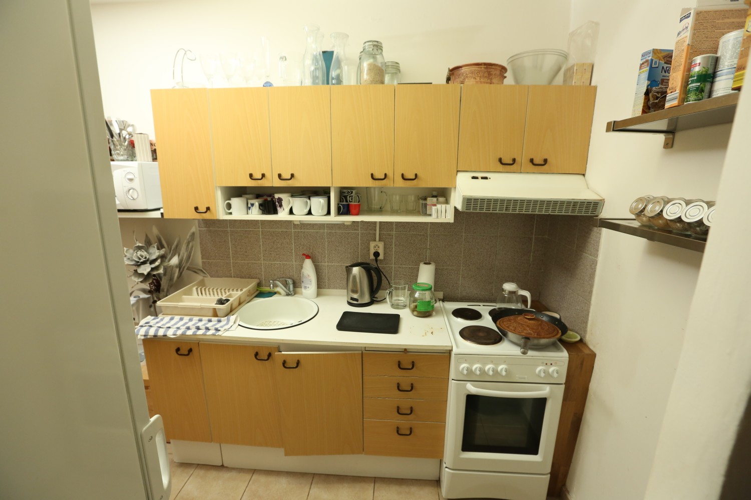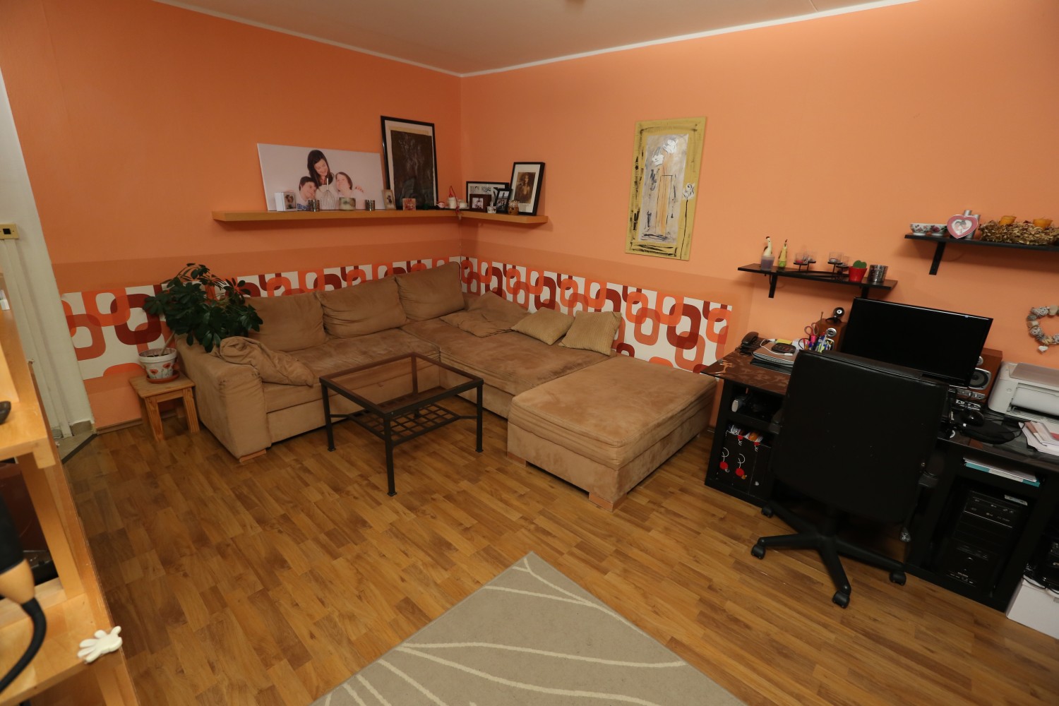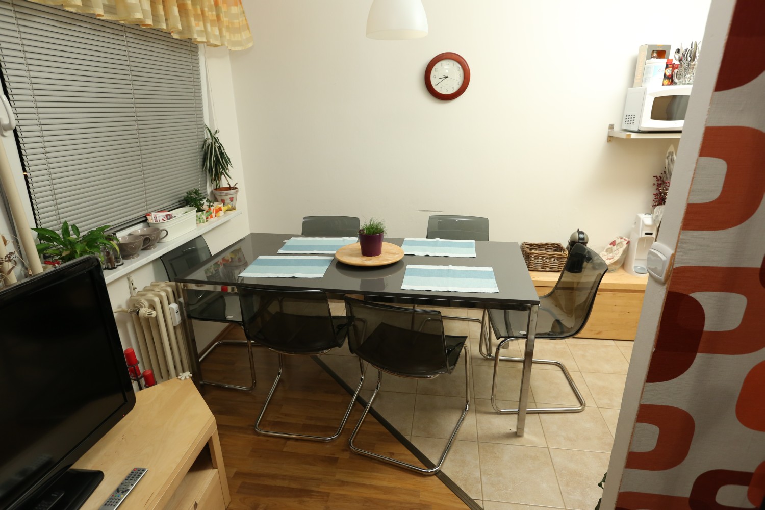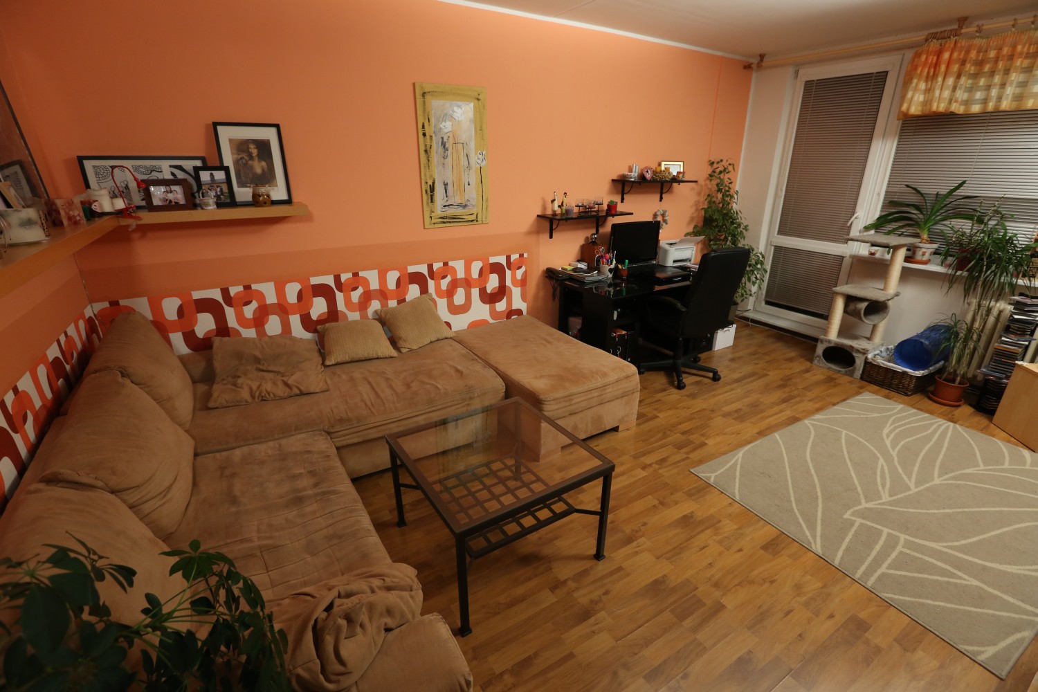 Hodnocení designérů: Pro nás to byla snad jedna z nejpovedenějších proměn vůbec. Máme z ní ohromnou radost. Jelikož jsme potřebovali do jedné místnosti umístit kuchyň, jídelní stůl, pracovní kout, oddělené spaní a ještě aby stále prostor splňoval úlohu obývacího pokoje, tak nešlo o okamžité vnuknutí, jak bude nové uspořádání vypadat. Nová dispozice se musela trochu »vysedět«. Původní prostor měl klasické neřesti paneláků, ale zásadním problémem bylo umístit mnoho funkcí na nevelký prostor jednoho pokoje. Největším »oříškem« se stala zavěšená truhlářská konstrukce knihovny a odkládacích prostor pro kuchyň, přecházející do jídelního stolu. Bylo nutné celou konstrukci co nejvíce odlehčit, protáhnout spolehlivě kabeláž a vymyslet uchycení do stropu. Provázali jsme kuchyň s obývacím pokojem – tím pádem se prostor opticky zvětšil. Zároveň jsme vytvořili oddělený spací kout pro dospělé, kteří dříve spali na rozkládací sedačce.