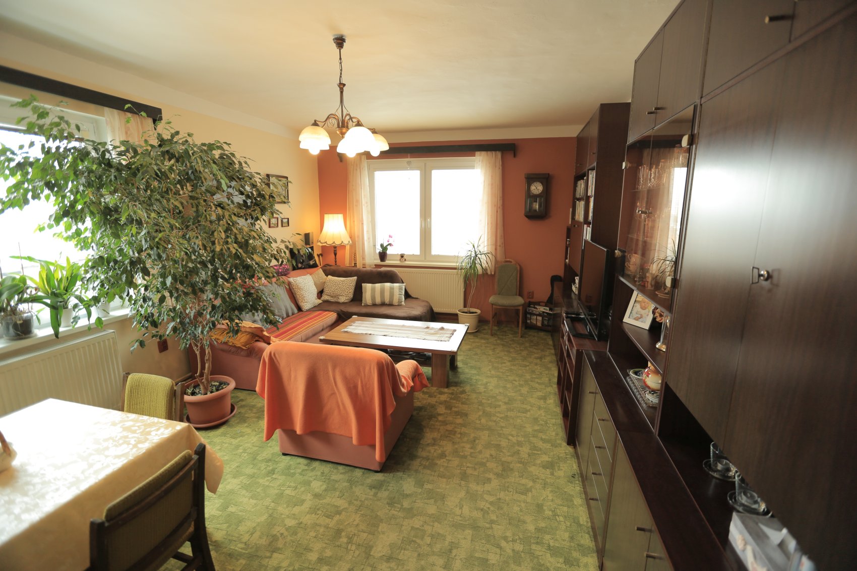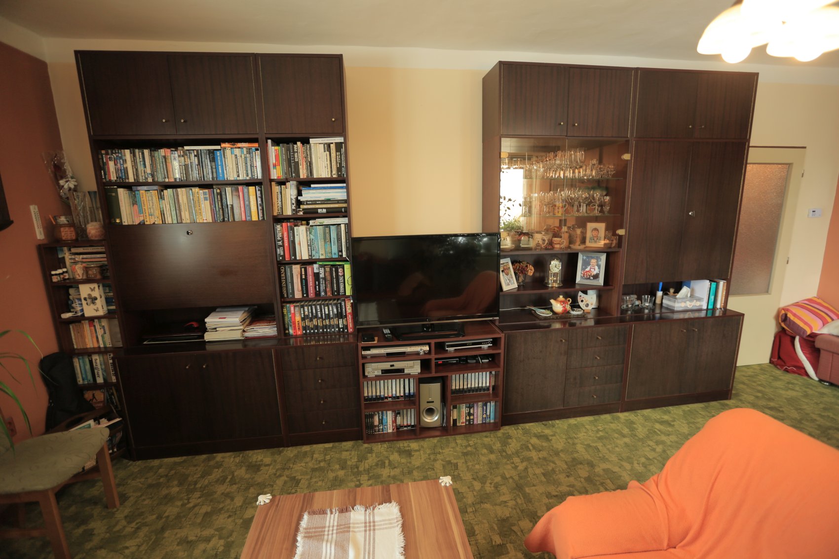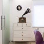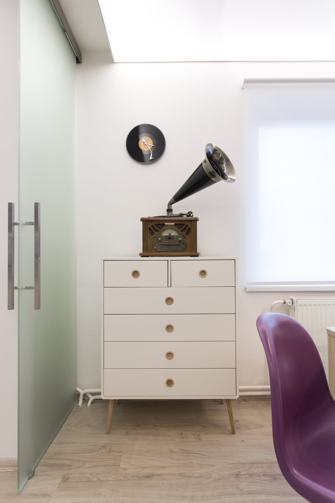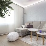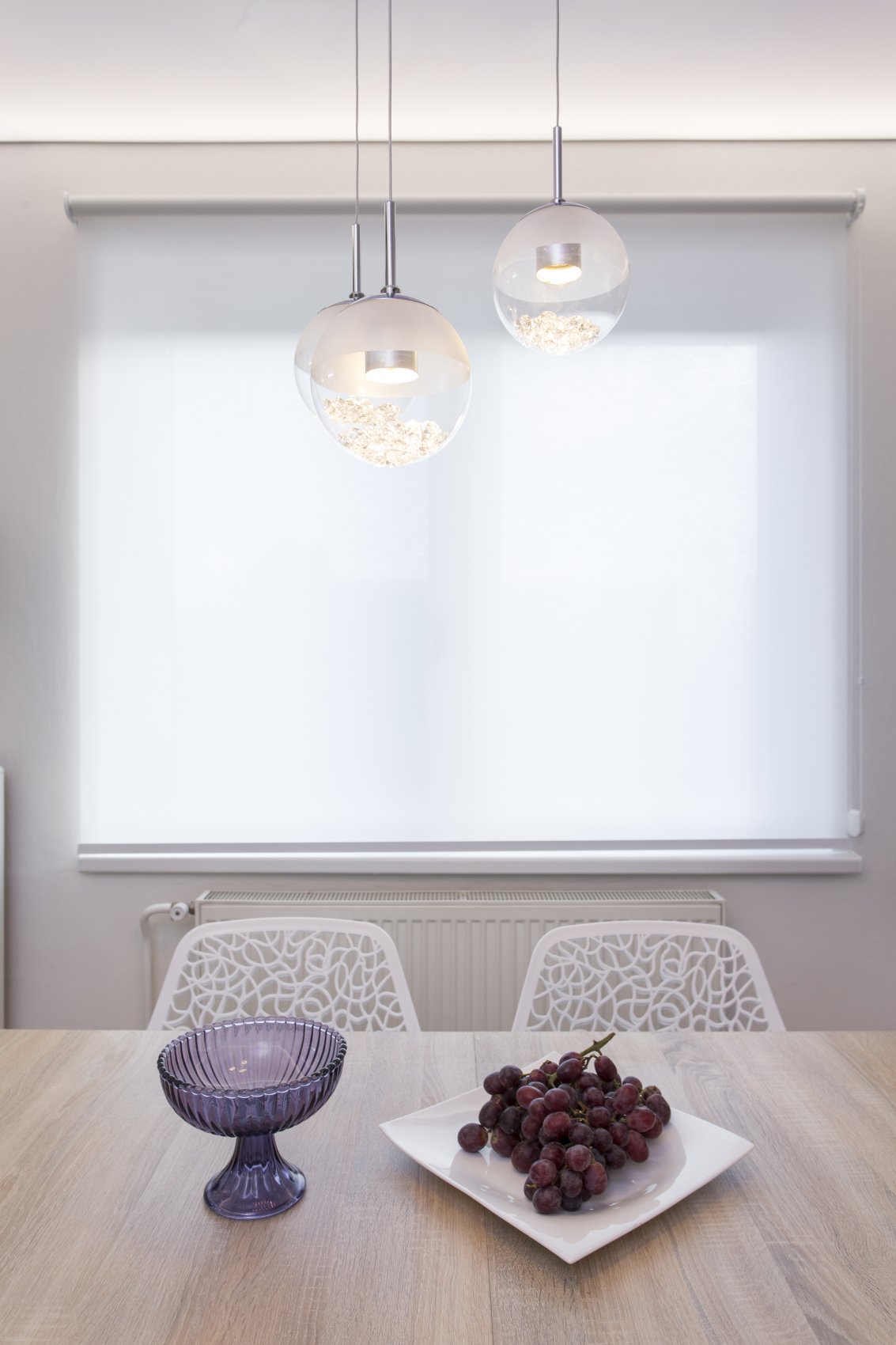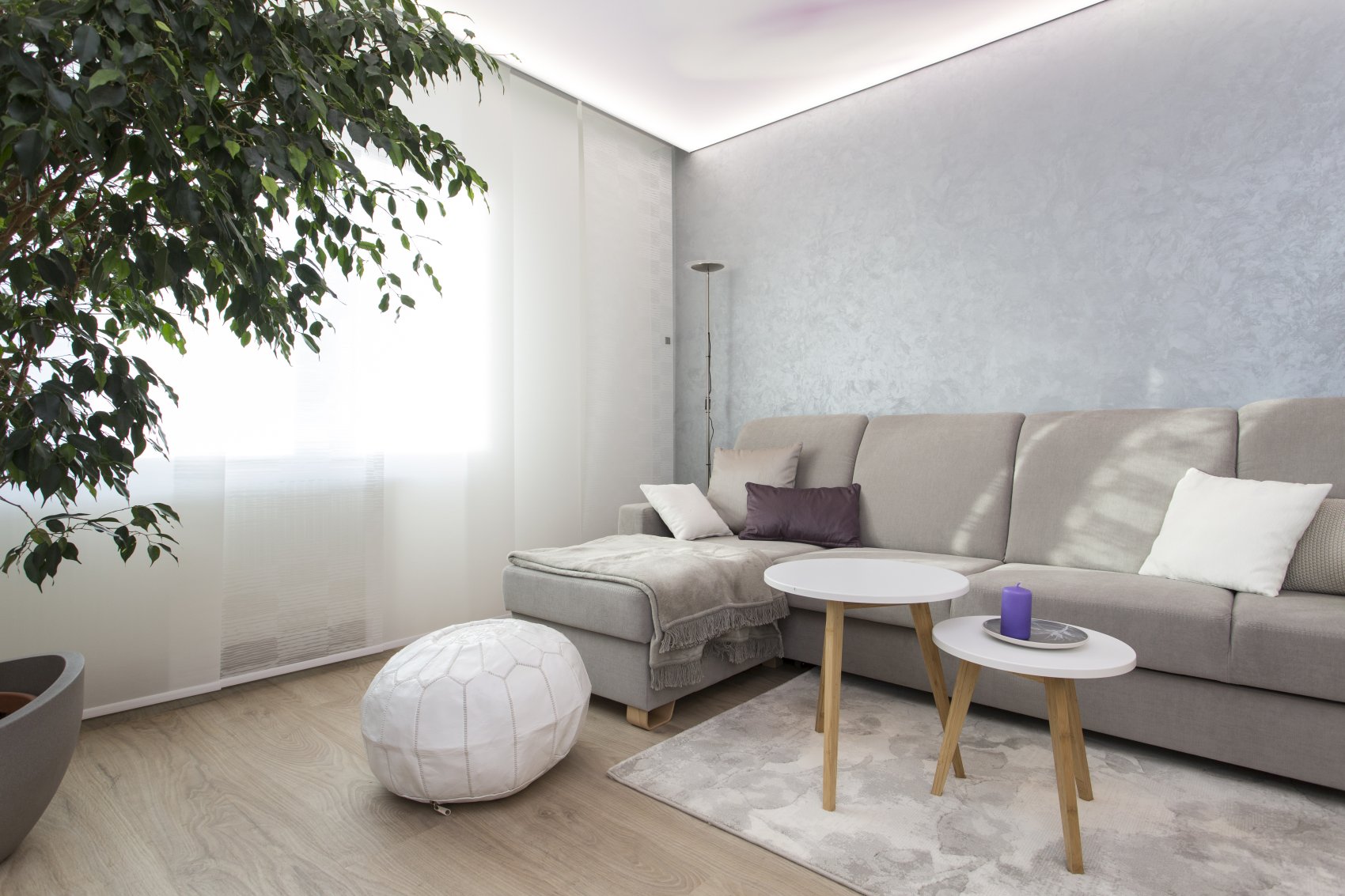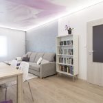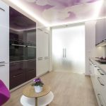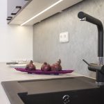 Styl je jednoznačně moderní. Věděli jsme o paní Barboře od její dcery, že má ráda moderní styl, uzavřené hladké povrchy a skříně. Snažili jsme se do jejího vkusu vcítit, má ráda i Francii, tak vznikl nápad s fialovou akcentující barvou. Zazdili jsme dveře do kuchyně, a tím, že obývák s kuchyní se stal jednou místností po vybourání dělicí příčky, byly zbytečné dva vchody. Kuchyně tak mohla být nakomponována po celé stěně, zvětšili jsme pracovní plochu, původní otevírací skříně jsme nahradili komfortními šuplíky. Osvětlení jsme vyřešili netradičně pomocí napínaných podhledů, které byly po obvodu prosvíceny LED pásky. V obou místnostech jsme navrhli podhled graficky potisknout dekorem detailu květu, je to něžný pozitivní motiv, připomínající svou barvou francouzskou Provence. Stěna za sedačkou byla pojednána dekorativním stříbřitým štukem, který působí kontrastně ke grafickému motivu na stropě.