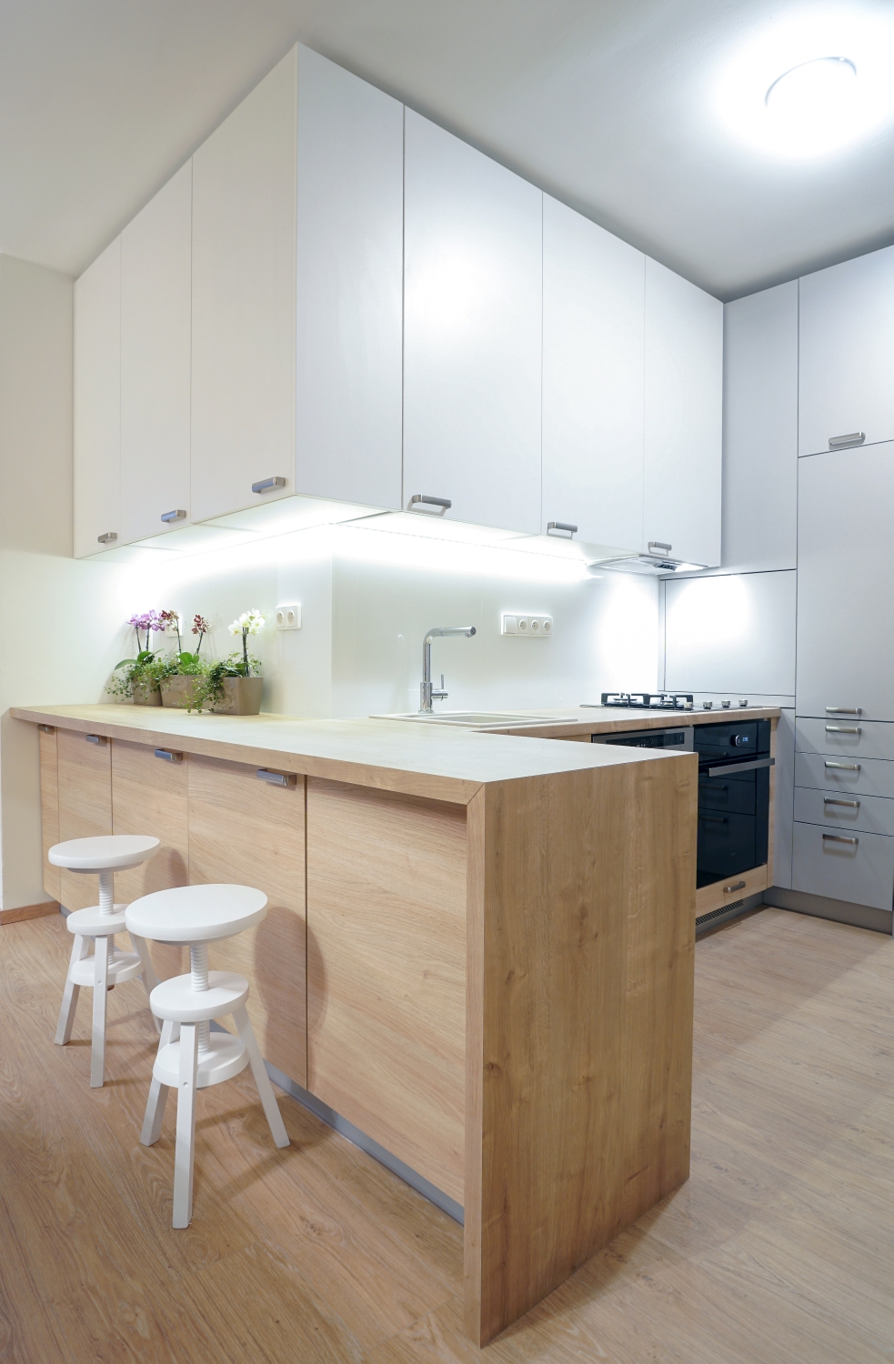 Lukáš: „Proměna to byla náročná, na první pohled se prostor nezdál tolik komplikovaný. Postupně jsme ale zjišťovali, že navrhnout smysluplnou dispozici (kuchyně), která bude vypadat dobře, nebude lehká věc – nešikovná pozice jádra, která nešťastně vystupuje do prostoru kuchyně a plynový kotel. Problémem prostoru byla také jeho členitost a rozměry, které byly pro zamýšlený návrh stísněné, pracovali jsme téměř s centimetrovými limity pro vhodné zařízení nábytkem. Celkově jsme vytvořili přívětivý, klidný interiér pro ,babičku s dědou‘, pracovali jsme s teplými tóny barev, aby interiér nebyl křiklavý ani sterilně bílý. Dominantou prostoru je přesah podlahové krytiny na stěnu za televizí – prostor se tak sjednotil a zklidnil. Původní nábytek nám vůbec neseděl do charakteru proměny, nebylo možné jej nikam zakomponovat. Jedině sedačka, která byla v dobrém stavu, našla v novém interiéru své místo. Plechová kuchyně přímo volala po vyhození. Radost mi udělala skleněná posuvná příčka, která nově odděluje obývací pokoje, které lze nyní jednoduše otevřením této příčky propojit, ale zároveň poskytuje i možnost nerušeného sledování televize v každém pokoji.“