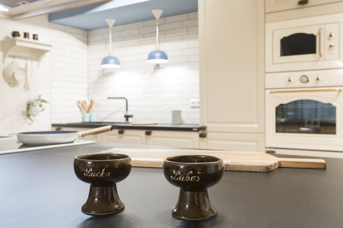 Hodnocení designérů: Letošní první a vydařená proměna je svým stylem jiná, než bývají ostatní proměny. Hned jsme totiž viděli, respektive cítili, velký potenciál, sílu genia loci. Dům je umístěn v panenské přírodě, s výhledem do kraje, dýchlo to na nás už při příchodu k domu, že budeme naslouchat místu a ctít ducha. Dům není starý, žádné problémy zapříčiněné zubem času jsme neočekávali, ale bylo zřejmé, že na interiér nezbyly prostředky a veškeré finance rodina investuje do rodinné farmy. Vybavení obývacího pokoje a kuchyně působilo ponuře a provizorně, nedodělaně. Např. místo kuchyňských skříněk byly jen korpusy skříní zakryté závěsy. Hlavní cílem bylo vnést citlivě venkovský styl do nového domu. V rámci dispoziční změny kuchyně jsme navrhli velký varný ostrůvek. Dále podtržení oblouku mezi kuchyní a obývacím pokojem obložením umělým kamenem. Možná je odvážné namalování původních masivních dřevěných dveří namodro.