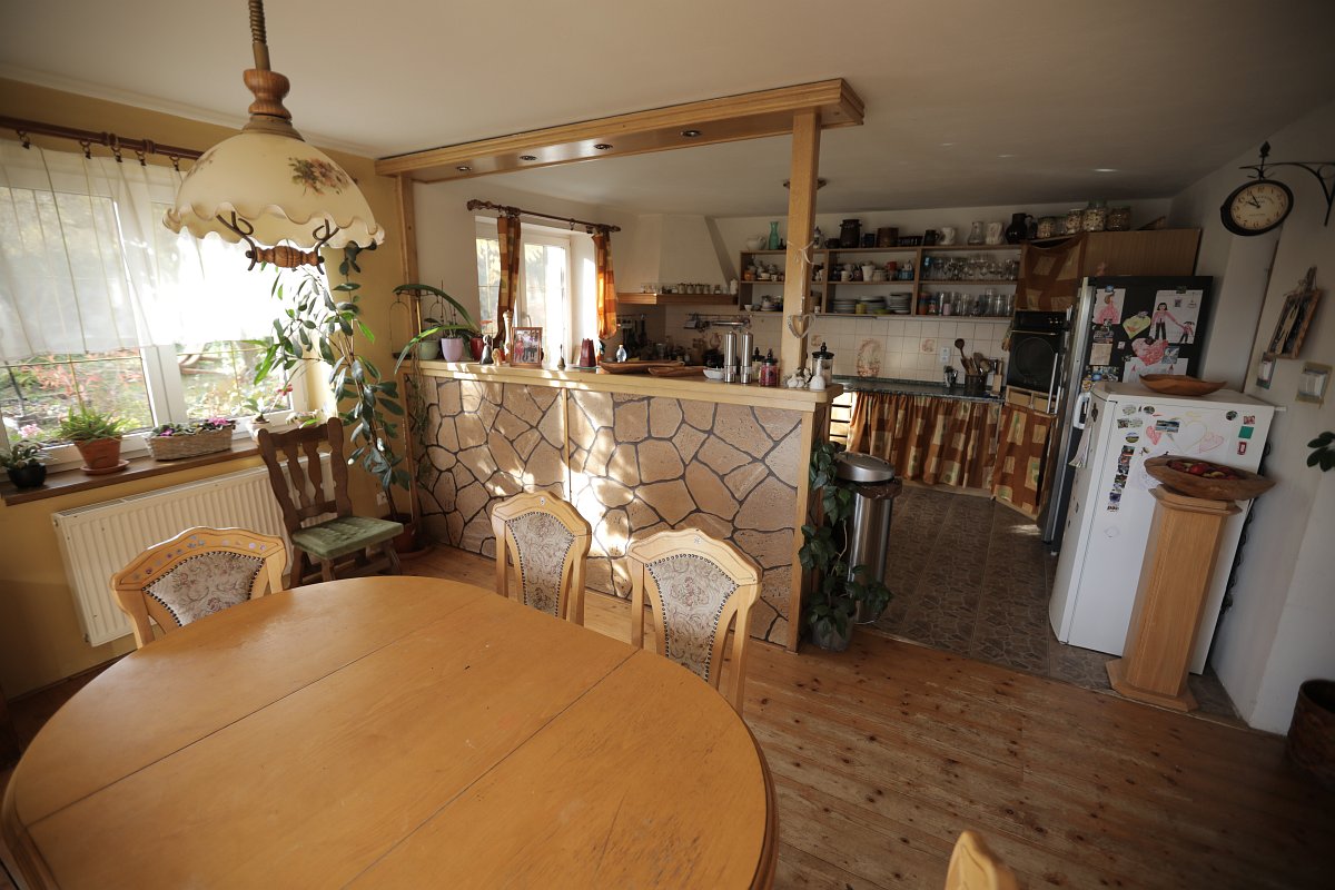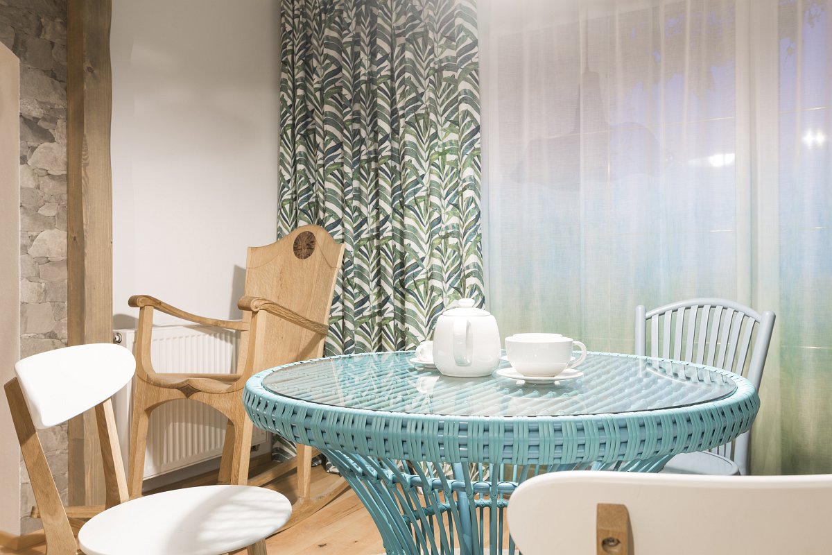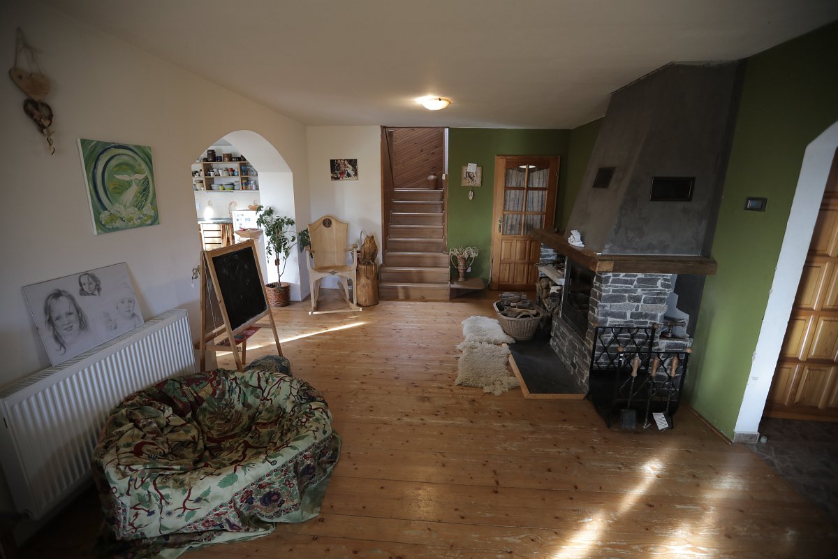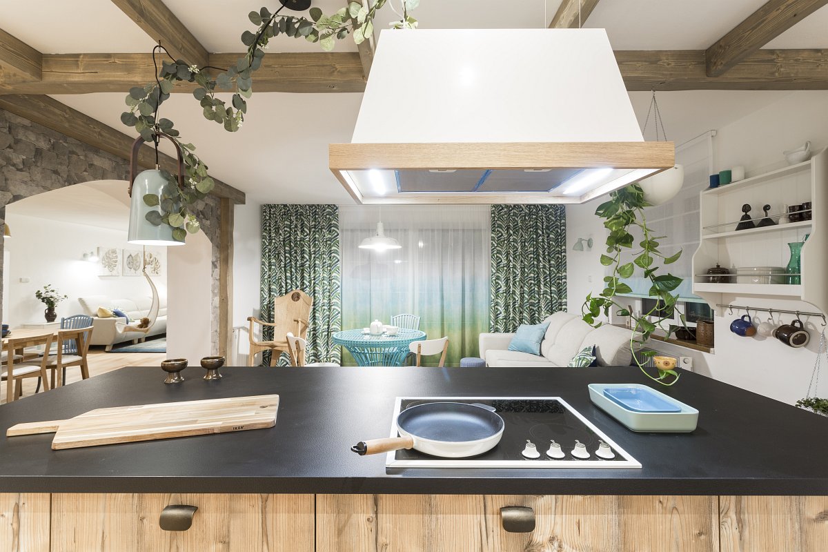 Výsledkem je svěží kombinace barev spjatá s okolní přírodou a respektování venkovského stylu s použitím přírodních materiálů, jako je dřevo, kámen. V proměně se nebouralo, nepropojovalo, naopak se zvýrazňoval kamenným obkladem obloukový průchod mezi místnostmi. Z kuchyně je krásný výhled do kraje, což nás inspirovalo kuchyni pojednat jako venkovní, navrhli jsme pod strop novou trámovou konstrukci, aby připomínala venkovní terasu, a její trámky jsme využili pro pnutí rostlin a osvětlení. Styl je jednoznačně venkovský, ovšem s moderními prvky černé pracovní desky nebo zastínění oken výraznými římskými roletami a závěsy s rostlinným motivem. Do kuchyně před okno jsme navrhli tzv. snídaňový stolek z ratanu v tyrkysové barvě. Hlavní jídelní stůl pro osm a více lidí jsme přemístili před krb, kde byl doteď prostor využíván jen jako průchod do kuchyně. Do budoucna by se měli majitelé zaměřit určitě na ložnici v patře, která je neútulná a také provizorně zařízená.