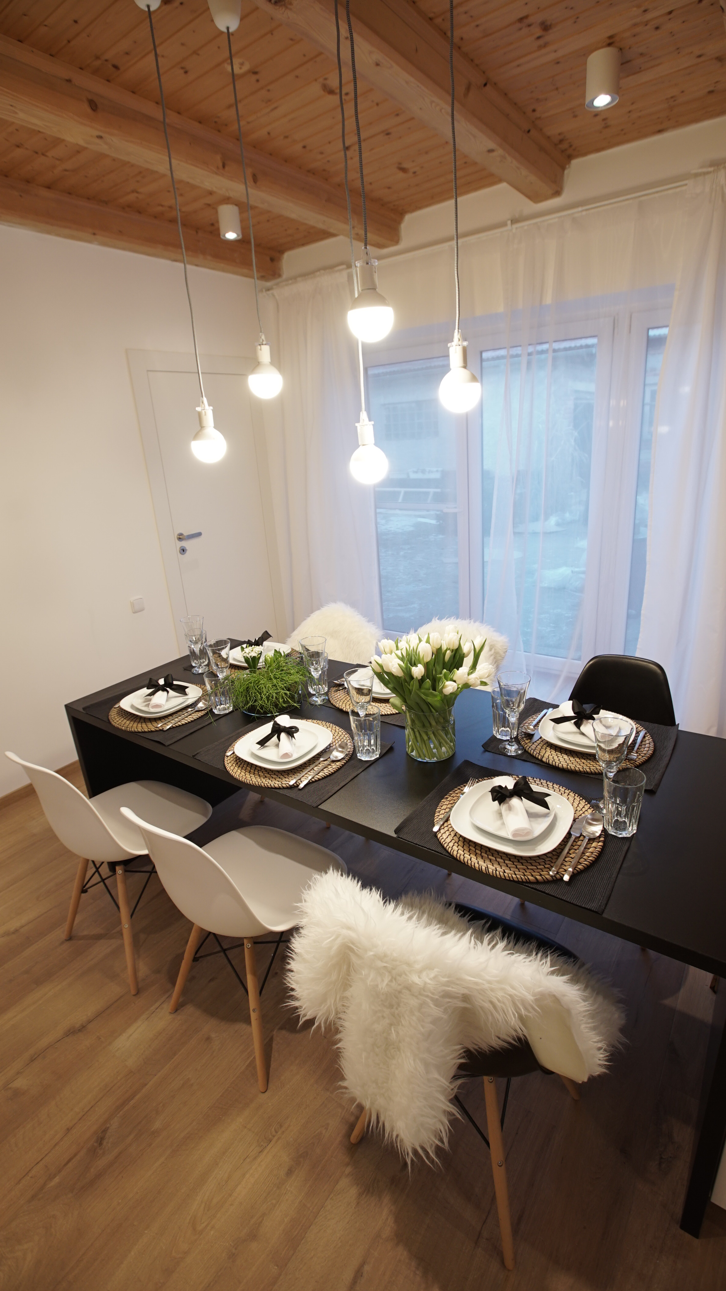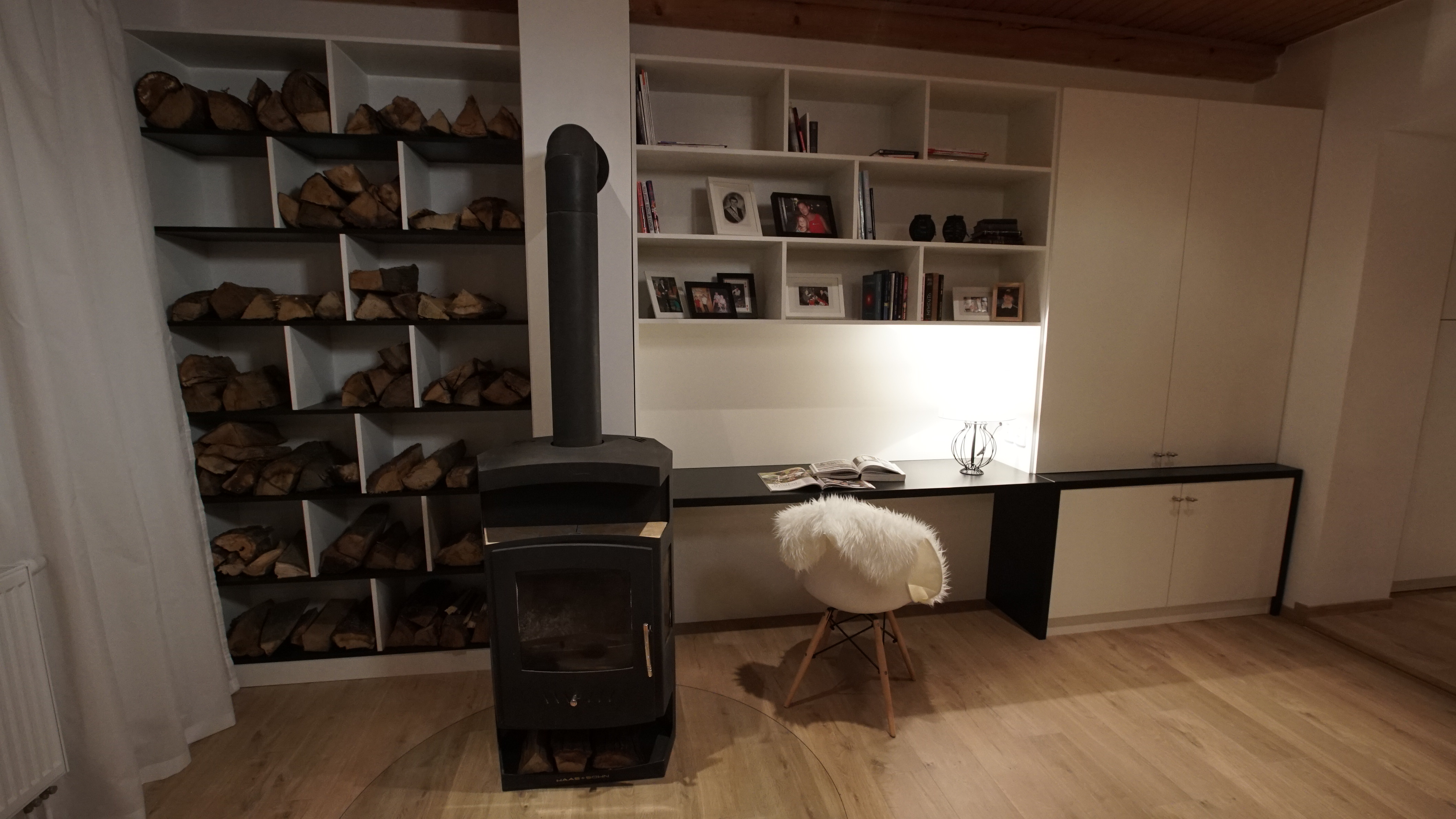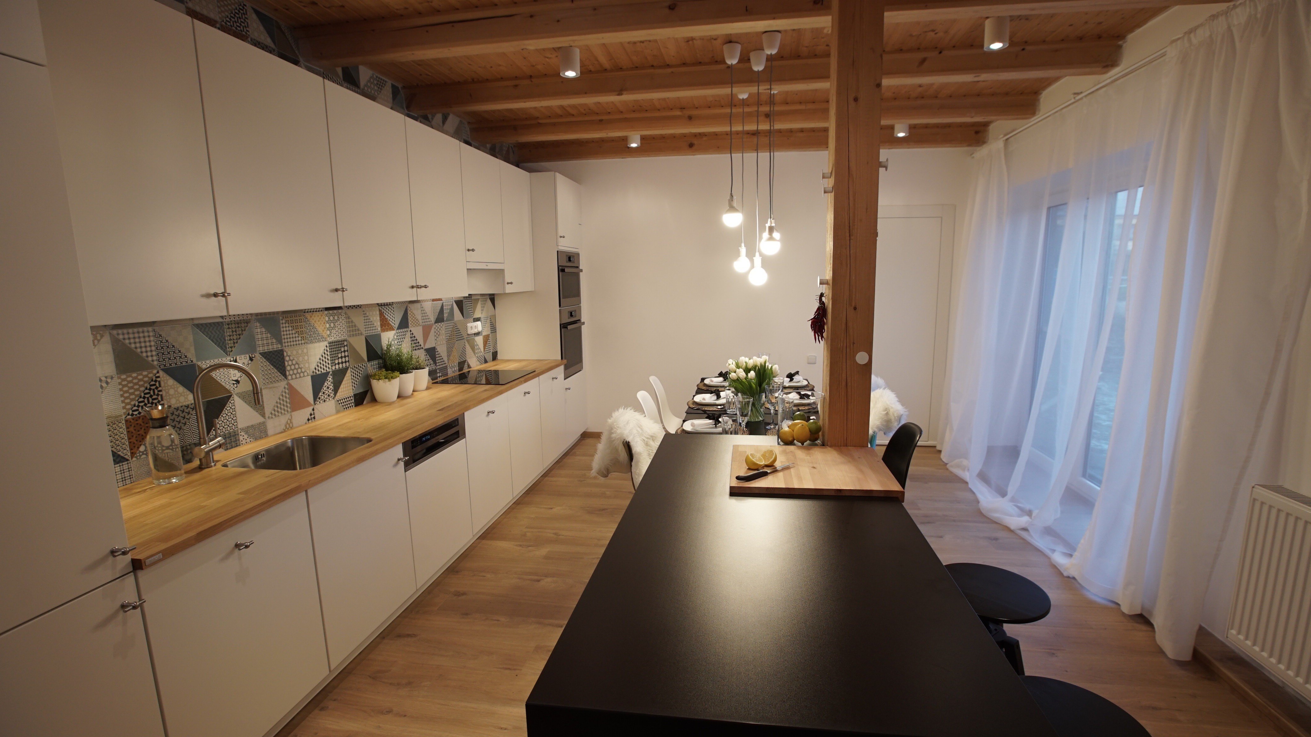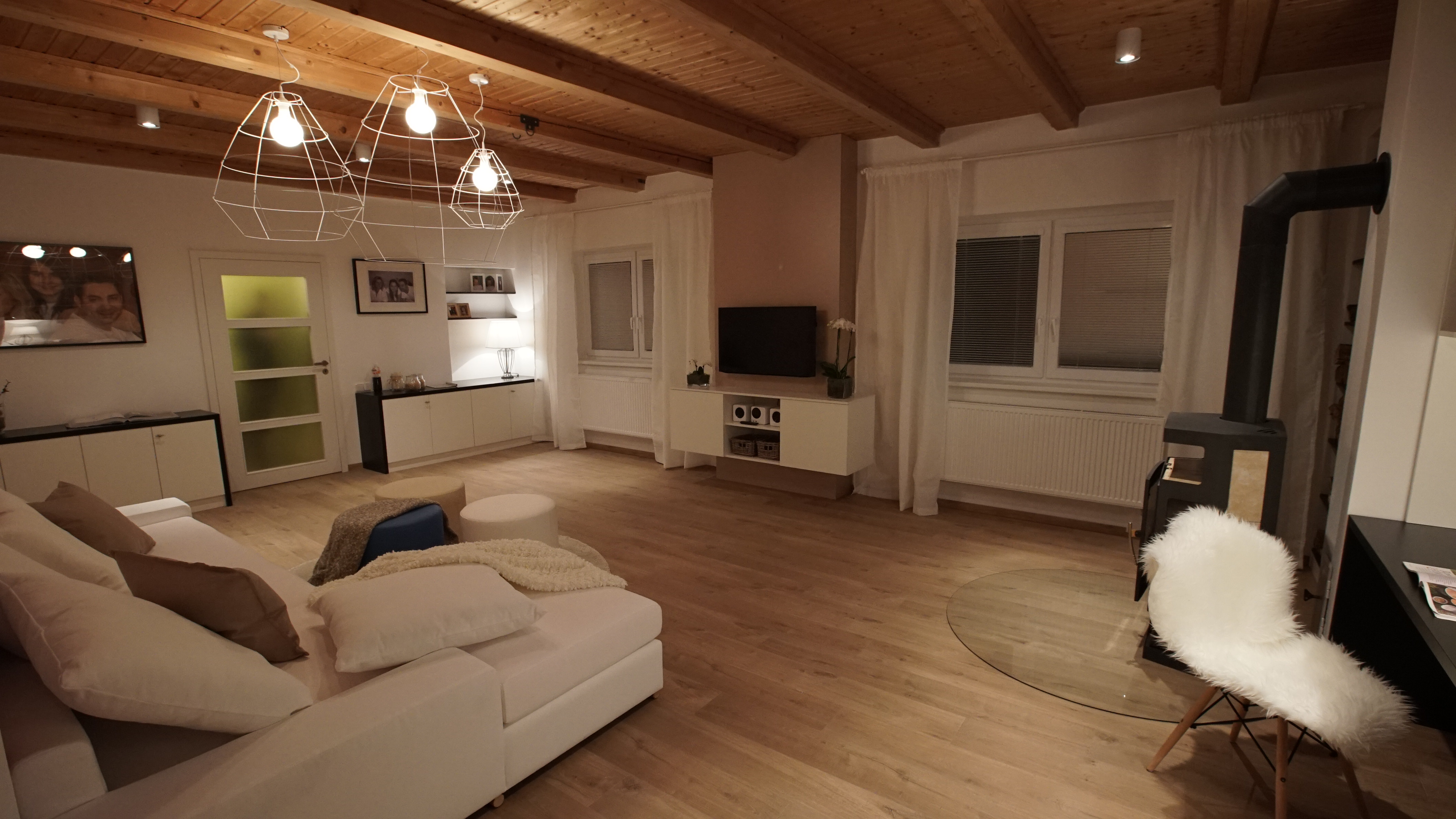 Martina: „Při první návštěvě nám bylo oběma jasné, že budeme pracovat s dřevěným stropem a celý prostor budeme chtít prosvětlit. Dispozici kuchyně jsme pak nechali podobnou původní, protože ta se nakonec ukázala jako nejlepší. Zásadním problémem původního stavu byl jednoduše řečeno stavební stav. Prostor nebyl vůbec vymalovaný, omítky byly v hrubém stavu, chyběla podlaha, museli jsme v rámci nové podlahy také zakrývat trubky od topení. Největší výzvou tedy byla úprava stěn a nová elektroinstalace v kombinaci s novou podlahou a dveřmi v tak krátkém čase. Celý prostor jsme sjednotili a spojili do jednoho. Předtím interiér vypadal kusově, různorodě prostě nesladěně. Rádi jsme také ponechali jejich krásné lampy a dali jsme jim jen nová stínidla . Lampy tak chytly úplně jiný šmrnc. Jsme rádi, že jsme kromě nové hifi věže a těchto lamp nechali všechny tři znovu vyfotit, aby měli konečně svoji společnou fotku, která krásně dekoruje nový obývací pokoj. Styl naší proměny by se dal nazvat moderní venkov. Pracovali jsme s jednoduchými tvary a materiály, ale s citem je používali. V případě venkovských interiérů by se mělo pracovat s opravdovými materiály jako dřevo, dlažba, látka, kůže… “