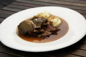 Dušené přední hovězí s artyčoky a kaší je z kližky, která se pro tuto úpravu skvěle hodí. Emanuele divákům ukáže, jak očistit a naporcovat zdravé a chutné artyčoky, které přidá k masu. Potřebujeme také slaninu, bílé víno, cibuli a česnek, nad masem si v páře uvaříme brambory. Kaše potom získá aroma po mase.