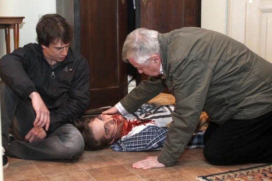 „Tahle scéna nebyla nijak náročná. Měl jsem krvácet do hrudníku, takže pode mnou měla být louže krve. Protože by se ale umělá krev vsákla do dekorace, což by se pak špatně čistilo, tak mě maskéři zakrváceli hlavně na oblečení. Měl jsem zapadlý jazyk a dusil jsem se. V životě jsem nic takového naštěstí neprožil. Nejvážnější úraz, jaký jsem měl, byl otřes mozku,“ vzpomíná Petr Konáš.