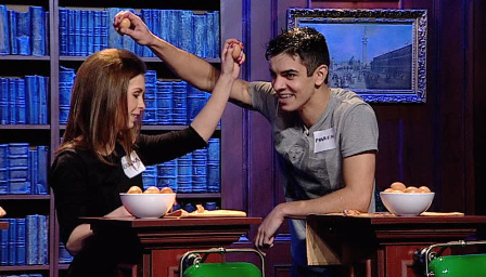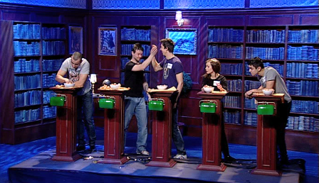 Hned poté můžeme do prvního kola. Otázky jsou jednoduché, až triviální, možnost odpovědět ale dostane jenom ten, kdo se odváží překonat fyzickou bolest a patřičně se o ni přihlásí: položí prsty do pastičky na myši. S bolestivou grimasou na tváři se i banální otázky odpovídají poměrně složitě. No schválně, je rajče ovoce, nebo zelenina? Taktéž druhé kolo je jakousi esencí české povahy: když něco víte nebo v něčem vynikáte, dostanete přes prsty, respektive vajíčkem o hlavu. Všechny správné odpovědi sice mají společné začáteční písmeno, ale co je vám to platné, když hlava dostává takový zásah. Jakmile se Iva Pazderková zeptá, jak se označuje svazek jednoho muže a dvou žen, Vojta bez váhání odpoví: „Bisexuální.“ Aby následně dodal: „Bisexuální… jsem blbec.“ A schválně, budou soutěžící s vajíčkem na hlavě, tváři i jinde po těle vědět, co se hlavně prodává v obchodě s obuví?