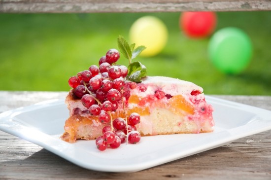 Bez dortu to na dětské oslavě nejde, Manu připraví broskvový dort s rybízem. Při výrobě těsta z mouky, cukru, vajec a vanilky pracuje se šlehačem a opět se neobejde bez papíru na vyložení formy, do níž rozprostře korpus, který obloží plátky broskví a posype kuličkami červeného rybízu. Fantazii se meze nekladou, můžeme improvizovat podle sezonní nabídky. Z jogurtu řeckého typu a smetany ušleháme vrchní krém a vše pečeme pětačtyřicet minut při 170 stupních. Zatímco děti dovádějí, dort zezlátne. Sladkou svačinu zapijí mléčným kokosovým koktejlem s jahodami.
