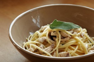 Těstoviny se v Itálii jedí obvykle jako předkrm, bude tomu tak i v neděli, kdy se Emanuele rozhodl pro pastu s línem. Tato ryba žijící ve stojatých vodách je však i trochu dravá, proto má tak jemné bílé masíčko. V Itálii pluje v deltách při ústí řek, kde se mísí sladká a slaná voda. Základ sosu tvoří máslo a šalotka, nakrájenou rybu krátce podusíme na bílém víně a na pánvi smísíme s nudlemi.