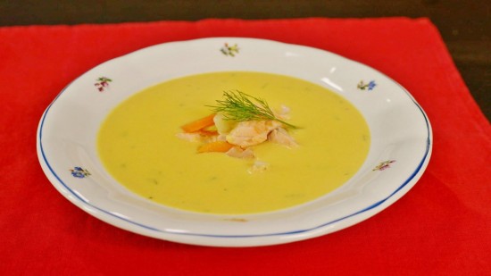3) Do každého talíře nalijte polévku, do středu dejte pár kostiček lososa a brambor, a ozdobte čerstvým koprem.