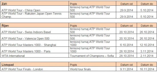 Tenis na prémiové stanici Nova Sport však zdaleka nekončí ani letos. Do konce roku 2014 na diváky čeká řada dalších skvělých utkání z ATP World Tour 500 (Peking, Tokio, Basilej, Valencie), ATP World Tour Masters 1000 (Šanghaj, Paříž) a WTA International v Sofii. Celý tenisový rok 2014 vyvrcholí přenosy z tradičního listopadového Turnaje mistrů z Londýna.