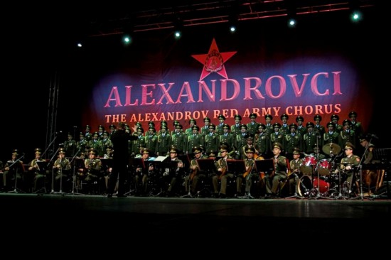„Základem repertoáru Alexandrovců jsou ruské národní a vojenské písně, přičemž tu nejznámější, Svjaščennaja vojna (Svatá válka), jim tu po sobě zanechal sám zakladatel souboru Alexandrov. Poprvé ji veřejně Alexandrovci předvedli v roce 1941, když vyprovázeli své vojáky do války. Na památku této události byla před časem na vlakovém nádraží v Bělorusku odhalena pamětní deska. V době 2. světové války se Alexandrovci rozdělili do několika skupin a jezdili tak zpěvem povzbuzovat sovětské vojáky na frontu, do zákopů i nemocnic. Tehdy absolvovali neuvěřitelných 1500 vystoupení. A právě v roce 2015, u příležitosti 70. výročí konce druhé světové války, bude tento odkaz připomenut v rámci celého turné.“