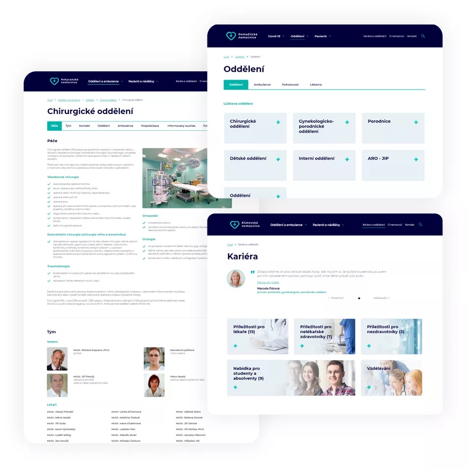 Díky novému modernímu webu se totiž změnila i správa stránek, která je jistě mnohem jednodušší než v systémech, které jsou mnohdy více než deset let staré. Vyznat se v nich je může být časově náročné, z čehož posléze pramení i fakt, že jsou vyvěšené neaktuální informace a nedochází k žádné nápravě. Nyní? Drtivou většinu obsahu si mohou nemocnice měnit samy dle svého uvážení – pro tyto činnosti je pak určen kompetentní zaměstnanec, který veškeré změny provádí. A jak už bylo zmíněno výše, vzhled a uživatelská intuitivnost webových stránek jsou zkrátka v dnešním internetovém prostředí jeho nedílnou a nutnou součástí.